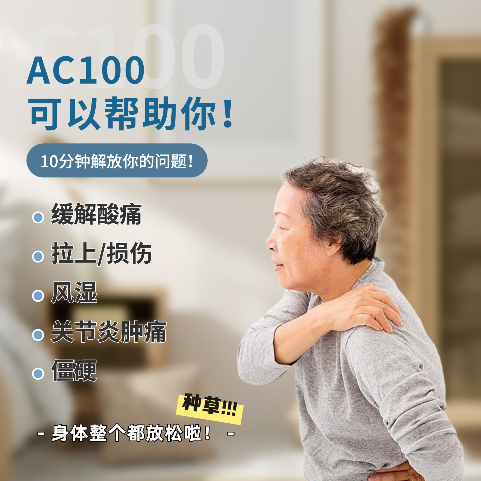 AC100酸痛喷雾,能够有效缓解这些疼痛和不适,让他们感受到舒适和放松
