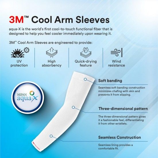 3M™ Cool Arm Sleeves are engineered to help you feel cooler imemdiately upon wearing it. These unique Cool Arm Sleeves offers high UV Protection, high absorbency, with quick drying and wind resistance features. These products are excellent for variety of outdors activities. Aqua-X is the world's first cool-to-touch functional fiber that is designed to help you feel cooler immediately upon wearing it. Suitable for a variety of outdoor activities