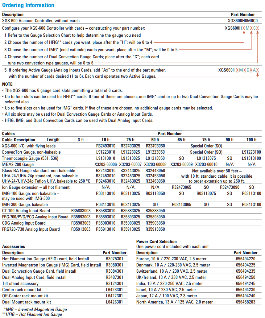 Ordering Information Description Part Number XGS-600 Vacuum Controller, without cards XGS600H0M0C0 Configure your XGS-600 Controller with cards – constructing your part number: XGS600HXMXCX 1 Refer to the Gauge Selection Chart to help determine the gauge you need 2 Choose the number of HFIG** cards you want; place after the ”H”; will be 0 to 4 3 Choose the number of IMG* (cold cathode) cards you want; place after the “M”; will be 0 to 5 4 Choose the number of Dual Convection Gauge Cards; place after the “C”; each card runs two convection type gauges, will be 0 to 6 5. If ordering Active Gauge (Analog Input) Cards, add “Ax” to the end of the part number, XGS600HXMXCXAX with the number of cards desired (1 to 6). Each card operates two Active Gauges. NOTE: • The XGS-600 has 6 gauge card slots permitting a total of 6 cards. • Up to four slots can be used for HFIG** cards. If four of these are chosen, one IMG* card or up to two Dual Convection Gauge Cards may be selected also. • Up to five slots can be used for IMG* cards. If five of these are chosen, no additional gauge cards may be selected. • All six slots may be used for Dual Convection Gauge Cards or Analog Input Cards. • HFIG, IMG, and Dual Convection Cards can be used with Dual Analog Input Cards. Cables Part Number Cable Description Length 3 ft 10 ft 25 ft 50 ft 65 ft 75 ft 90 ft 100 ft XGS-600 I/O, with flying leads R32493010 R32493025 R32493050 Special Order (SO) ConvecTorr Gauge, non-bakeable L91223010 L91223025 L91223050 Special Order (SO) L91223100 Thermocouple Gauge (531, 536) L91313010 L91313025 L91313050 SO L91313075 SO L91313100 MBA2-200 Gauge X3203-60006 X3203-60007 X3203-60008 X3203-60009 X3203-60010 N/A N/A Glass BA Gauge standard, non-bakeable R32443010 R32443025 R32443050 UHV-24/UHV-24p standard, non-bakeable R32453010 R32453025 R32453050 UHV-24/UHV-24p Teflon UHV, bakeable to 250 °C R32463010 R32463025 R32463050 Ion Gauge extension – all hot filament N/A N/A N/A R32473065 SO R32473090 SO IMG-100 Gauge, non-bakeable – R03113010 R03113025 R03113050 SO R03113075 SO R03113100 may be used with IMG-300 IMG-300 Gauge, bakeable R03413010 R03413025 SO R03413065 SO SO R03413100 CT-100 Analog Input Board R35883003 R35883010 R35883025 R35883050 FRG-700/PVG/PCG Analog Input Board R35893003 R35893010 R35893025 R35893050 CDG Analog Input Board R35903003 R35903010 R35903025 R35903050 FRG720/730 Analog Input Board R35913003 R35913010 R35913025 R35913050 Not available over 50 feet – with 10 ft. standard cable, it is possible to order extension up to 250 ft. Accessories Description Part Number Hot Filament Ion Gauge (HFIG) card, field Install R3075301 Inverted Magnetron Ion Gauge (IMG) Card, field install R3080301 Dual Convection Gauge Card, field install R3084301 Dual Analog Input Card, field install R3487301 Tilt stand accessory R3124301 Center rack mount kit L6423301 Off-Center rack mount kit L6422301 Dual Mount rack mount kit L6426301 **IMG – Inverted Magnetron Gauge **HFIG – Hot Filament Ion Gauge Power Cord Selection One power cord included with each unit Description Part Number Europe, 10 A / 220-230 VAC, 2.5 meter 656494220 Denmark, 10 A / 220-230 VAC, 2.5 meter 656494225 Switzerland, 10 A / 230 VAC, 2.5 meter 656494235 UK/Ireland, 13 A / 230 VAC, 2.5 meter 656494250 India, 10 A / 220-250 VAC, 2.5 meter 656494245 Israel, 10 A / 230 VAC, 2.5 meter 656494230 Japan, 12 A / 100 VAC, 2.3 meter 656494240 North America, 13 A / 125 VAC, 2.0 meter 656458203