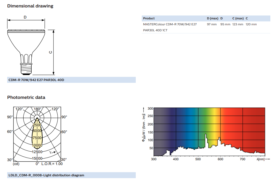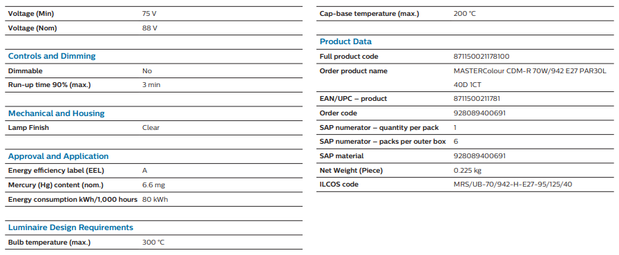 - Product Model: PHILIPS MASTERCOLOUR CDM-R 70W/942 E27 PAR30 40D 928089400691