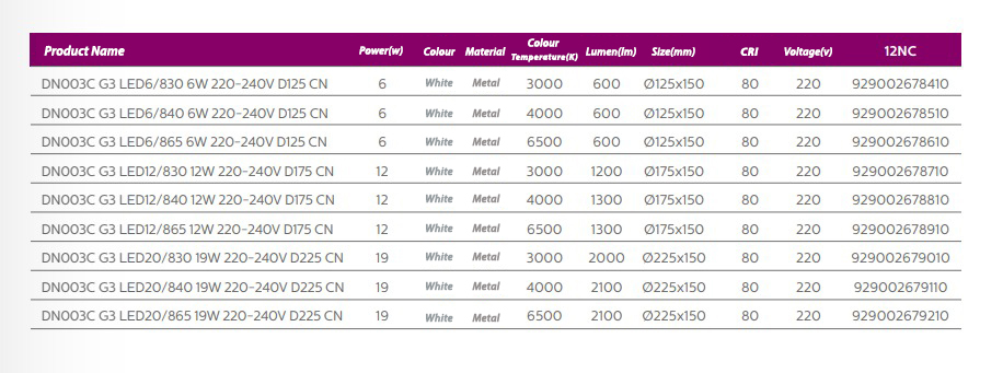 Order code (12NC) 3000K : 929002679010 4000K : 929002679110 6500K : 929002679210