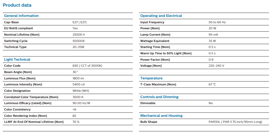Energy-Efficient 20W LED – Replaces traditional CDM PAR30L lamps with lower energy consumption