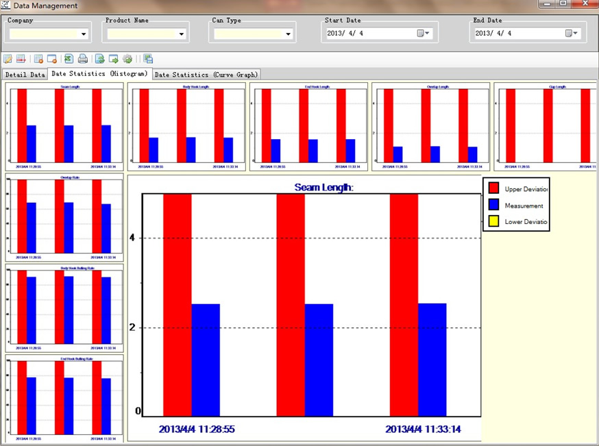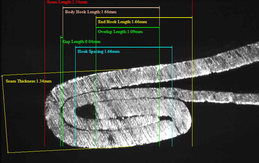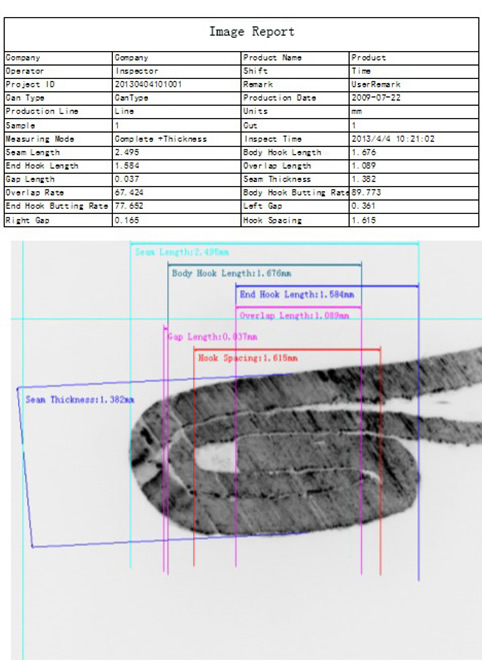 • 9measuring parameters: Seam Length, Body Hook Length, End Hook Length, Overlap, Seam gap, Overlap rate, Body Hook lapping rate, End Hook lapping rate, On-screen Seam Thickness.(Able to extend to 12 parameters through extra gauges, included actual Seam Thickness, actual countersink and Tightness)