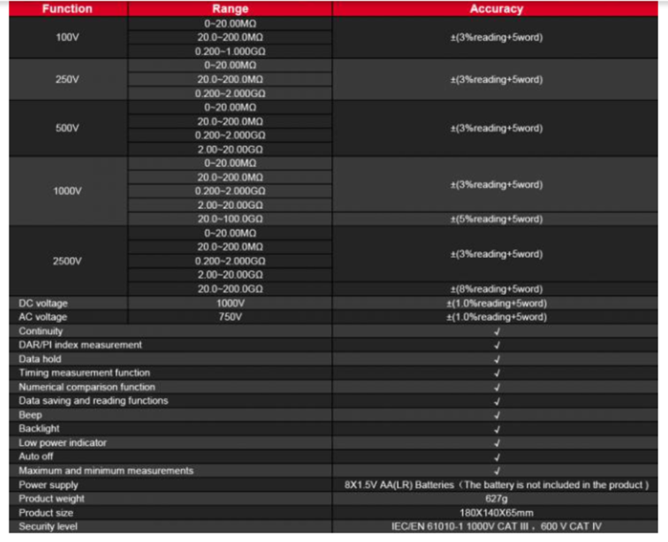 1. Insulation Resistance Testing: This megohmeter is capable of testing insulation resistance within a range of 250V-2500V. It ensures accurate and reliable measurements for assessing the quality of insulation in various electrical systems.