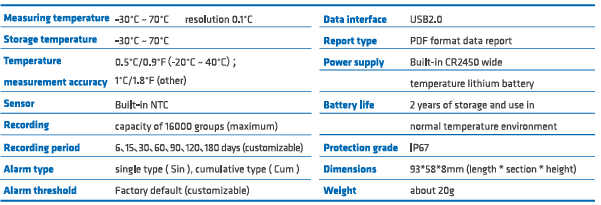 This temperature recorder is mainly used for temperature monitoring and recording of food and medicine storage and transportation environments, such as refrigerated bags, refrigerated trucks, containers, etc. This product is connected to a computer via USB, and the recorded data is directly output as a PDF report; the temperature probe is built-in, powered by a CR2450 wide temperature lithium battery, and the waterproof level reaches IP67. The product is equipped with a barcode.