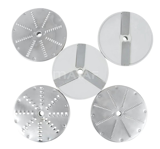 Equipped with two feeder hoppers for different product sizes and shapes, it allows efficient slicing, shredding, and cubing with ease. Comes with 5 + 1 premium cutting blades/discs, including: