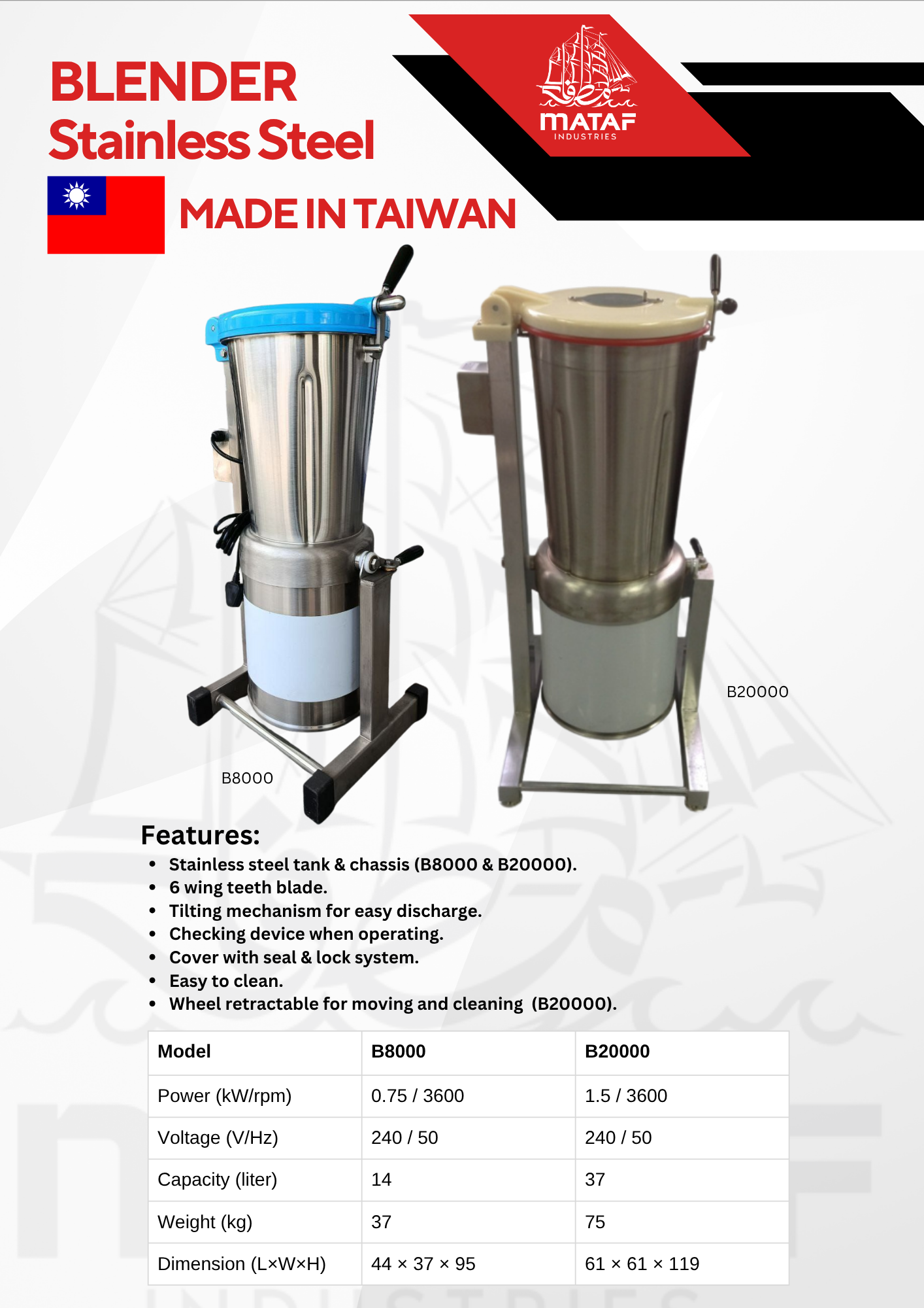 The Taiwan Blender B8000 is a heavy-duty industrial blender designed for professional use in food and beverage preparation. It is suitable for making a wide range of products including juice, smoothies, sauces, pastes, and seasonings. The stainless steel body can be tilted for easy pouring and cleaning, ensuring convenience and hygiene in daily operation. Built entirely from high-quality stainless steel, this blender is durable, resistant to corrosion, and easy to maintain — perfect for commercial kitchens, restaurants, and food production industries.