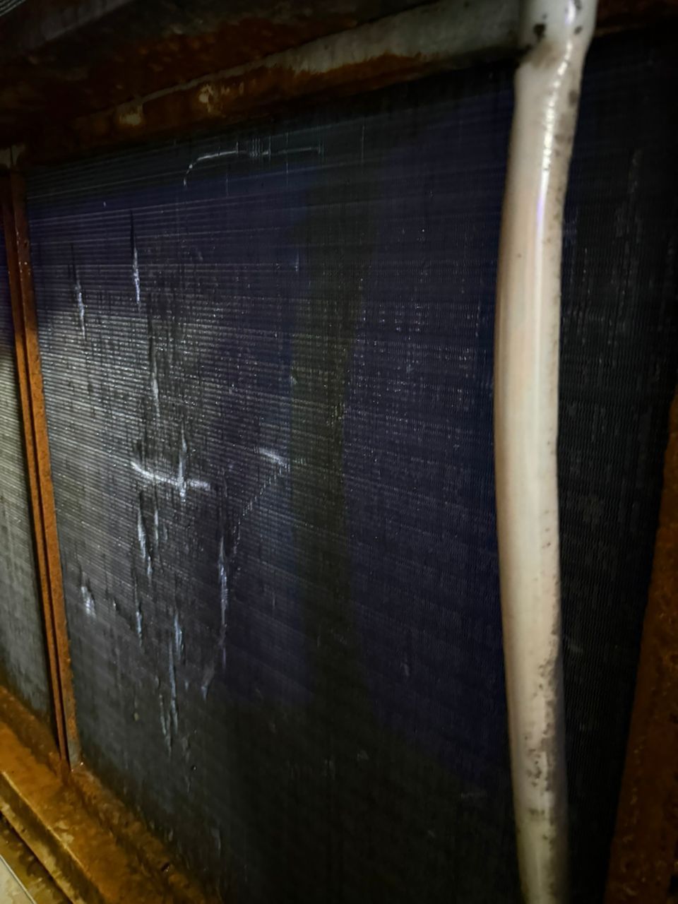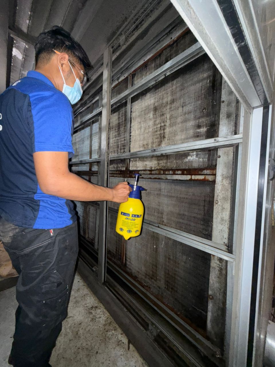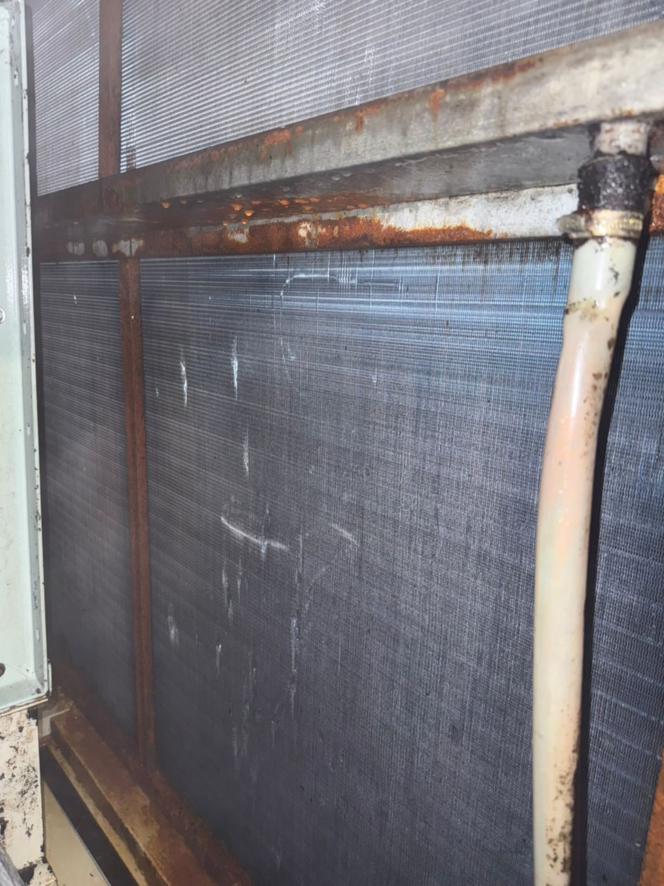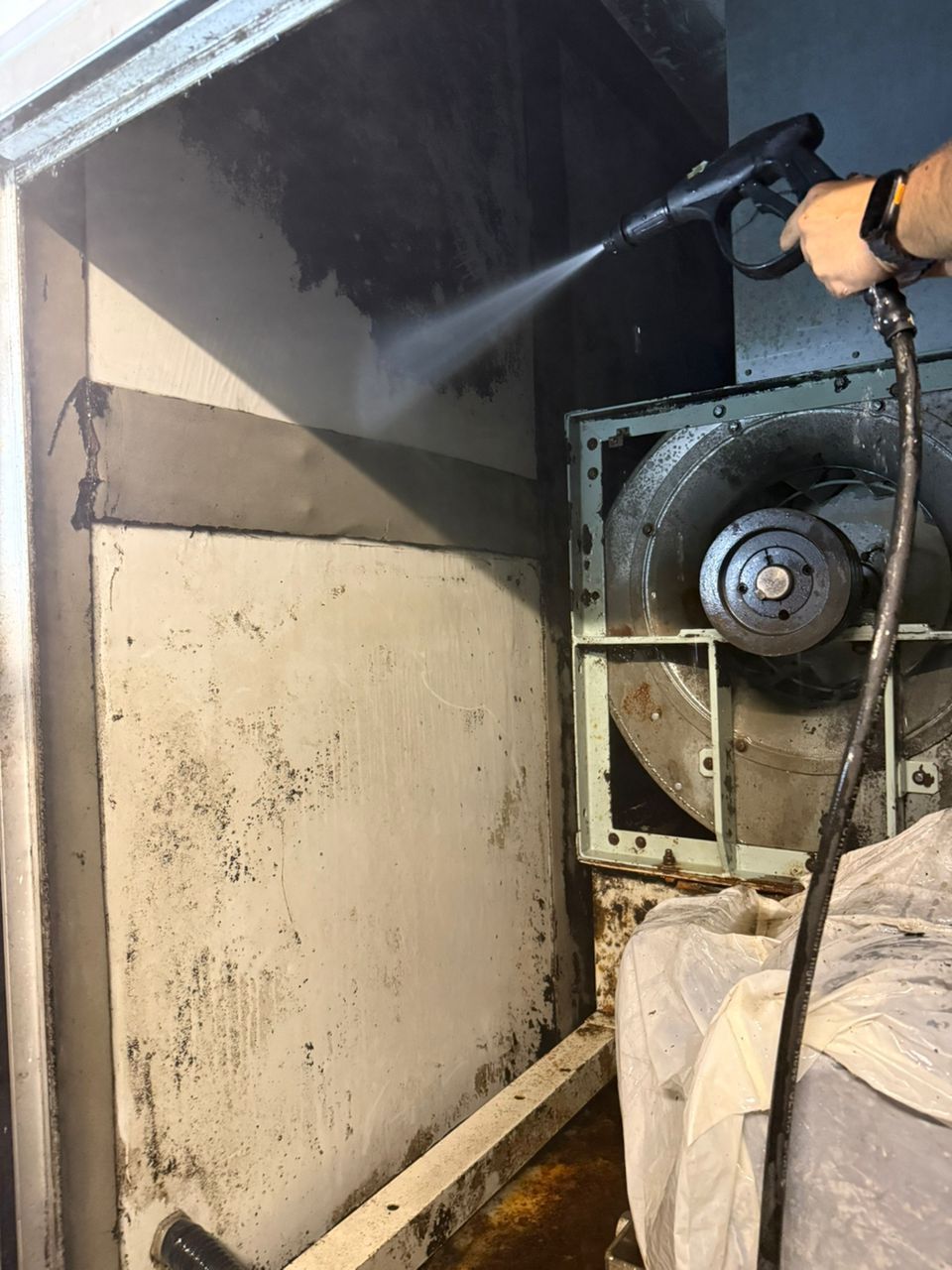Stage 1: High-Pressure Water Jetting: We began with a mechanical water jet wash to dislodge heavy surface debris, dust, and particulate matter from the external fin surfaces.