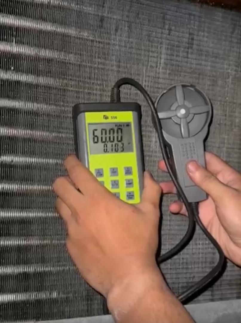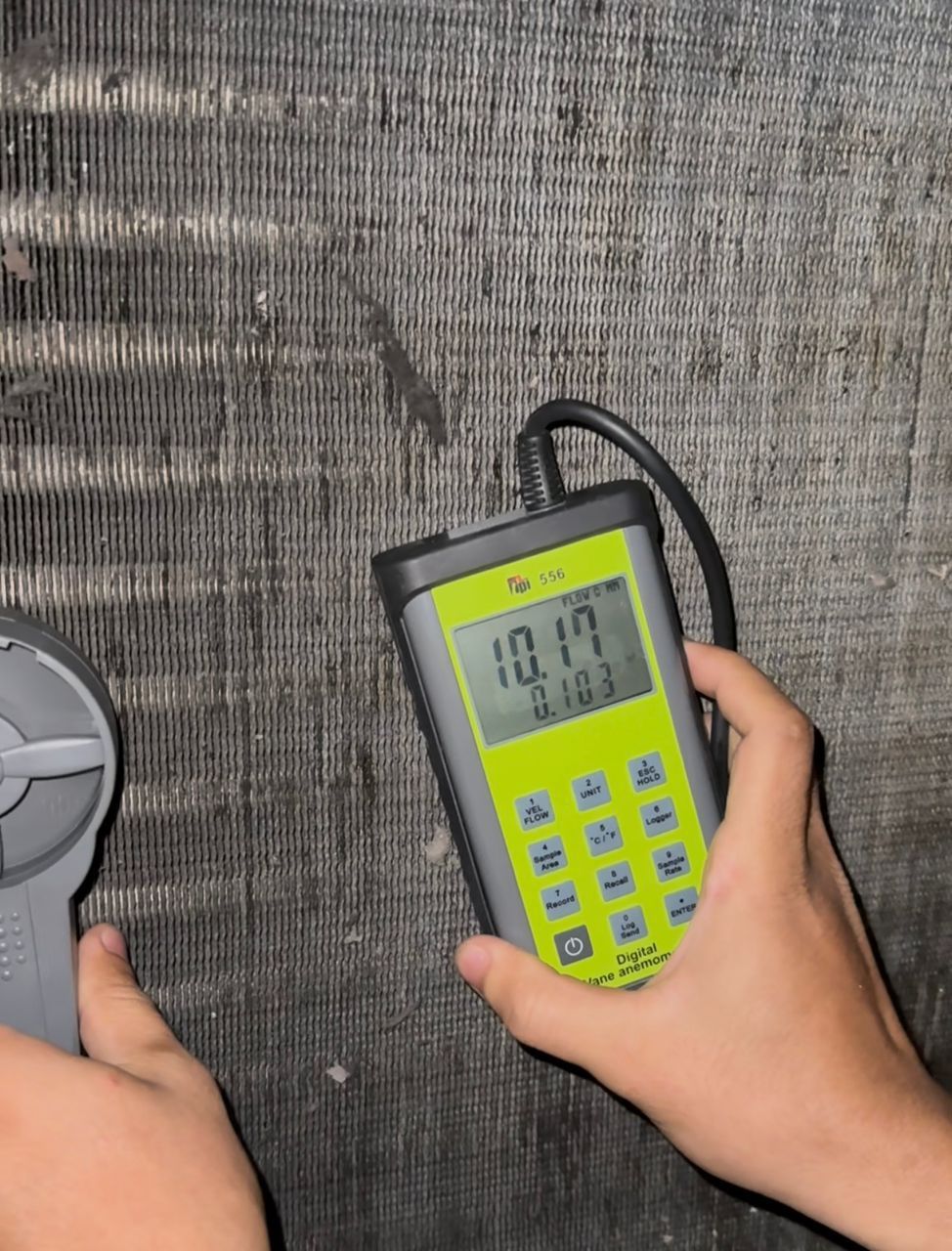 Performance Audit (Air Flow Testing): Following the cleaning, our technicians performed an Anemometer Air Flow Test. By measuring the air velocity (m/s) at the discharge grilles, we confirmed a significant increase in "Air Throw" strength, proving the internal obstructions were successfully cleared.