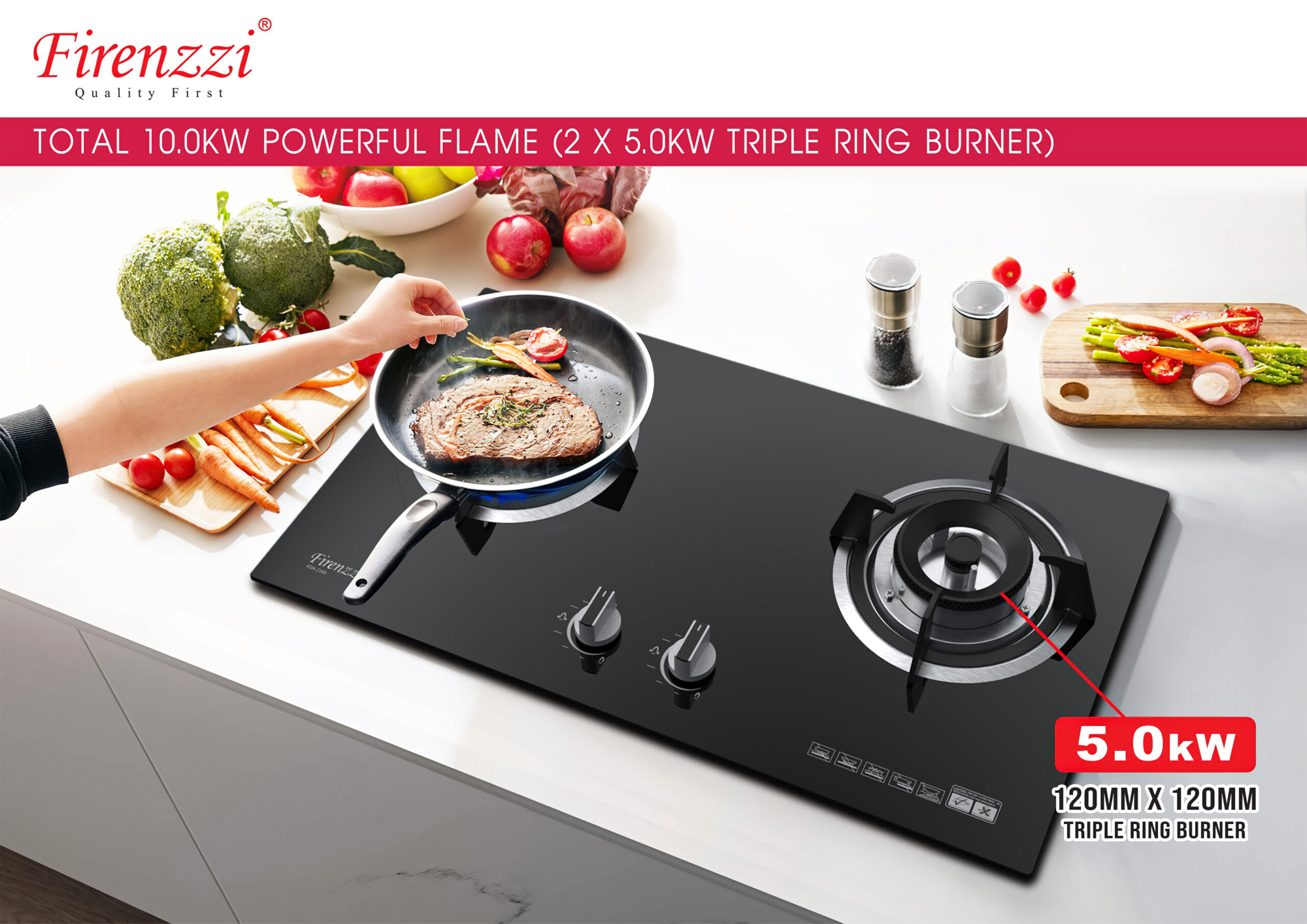 - Burners: 2 x triple ring burner 5.0kW