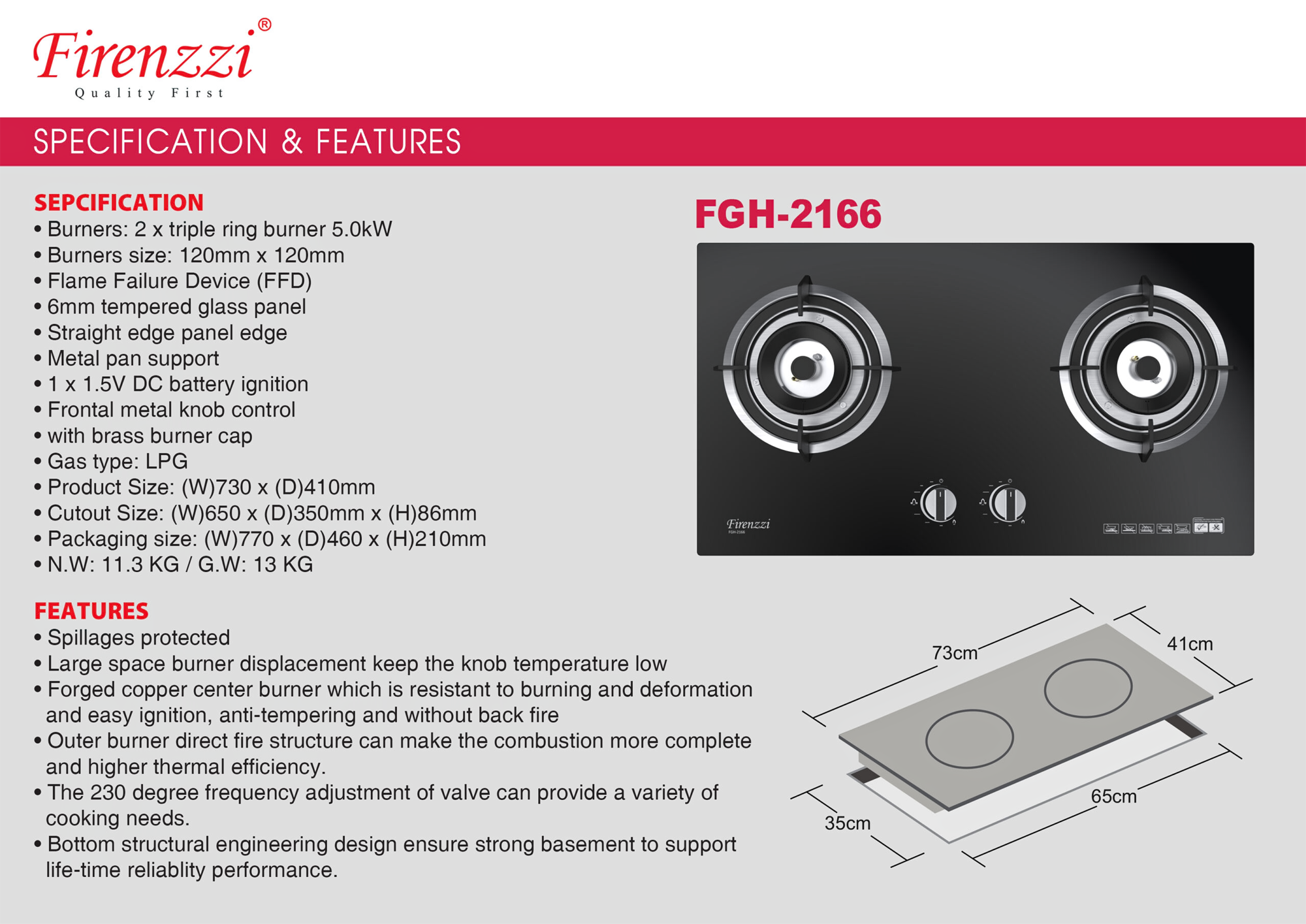 - Cutout Size: (W)650 x (D)350mm x (H)86mm