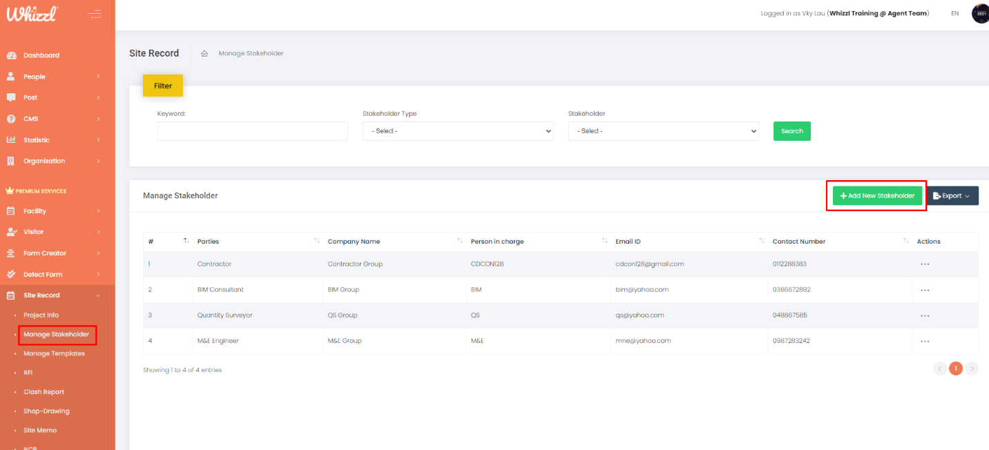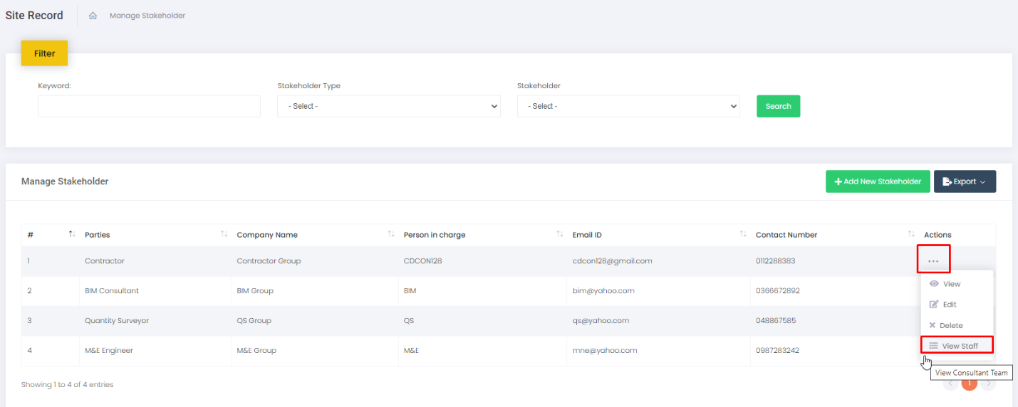 Step 2: Click “+ Add New Stakeholder”.Step 3: You are required to fill in all compulsory fields to update the Contractors and Consultants’ company details.