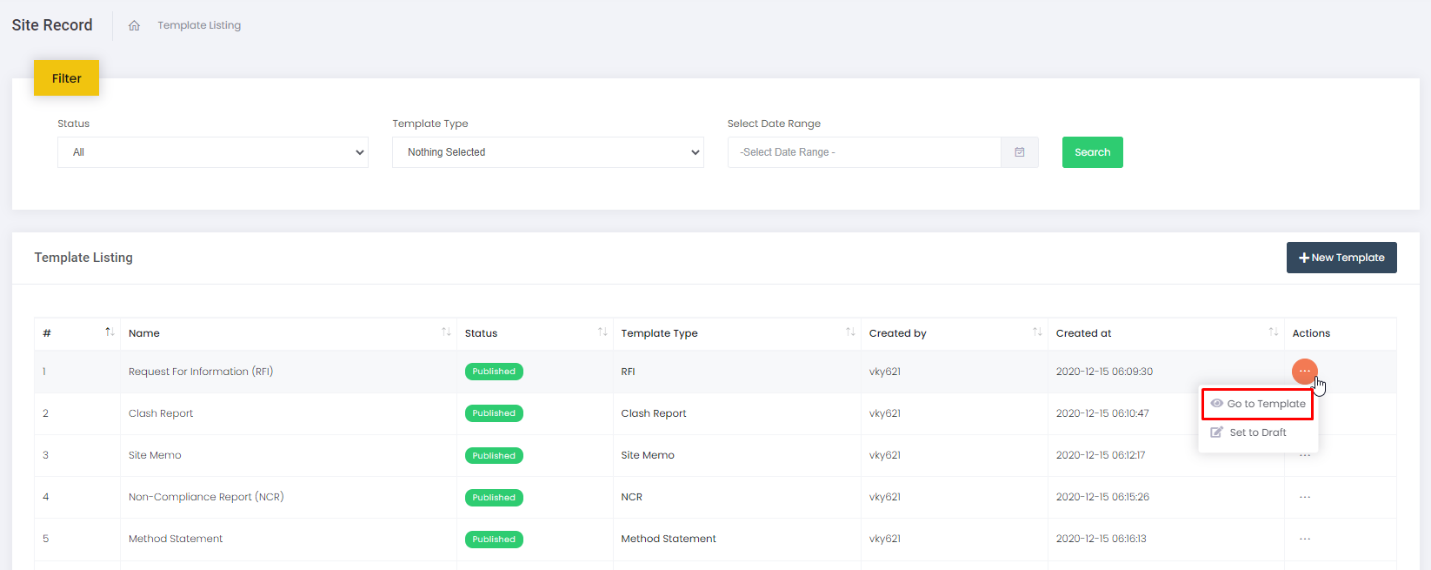 Step 3: Click on action button “…” > “Go to Template” to review the draft template.