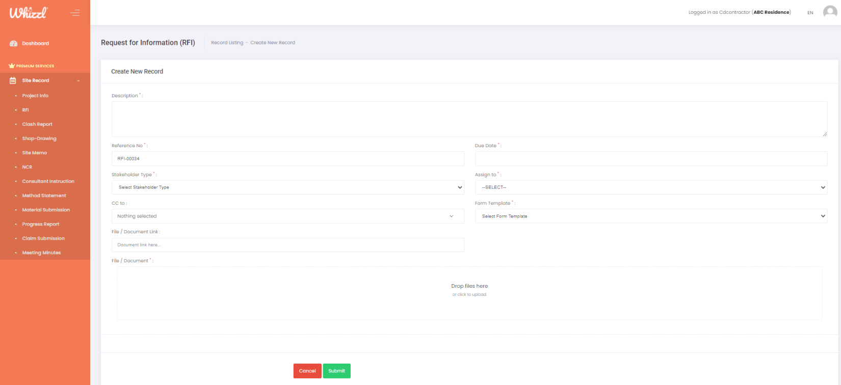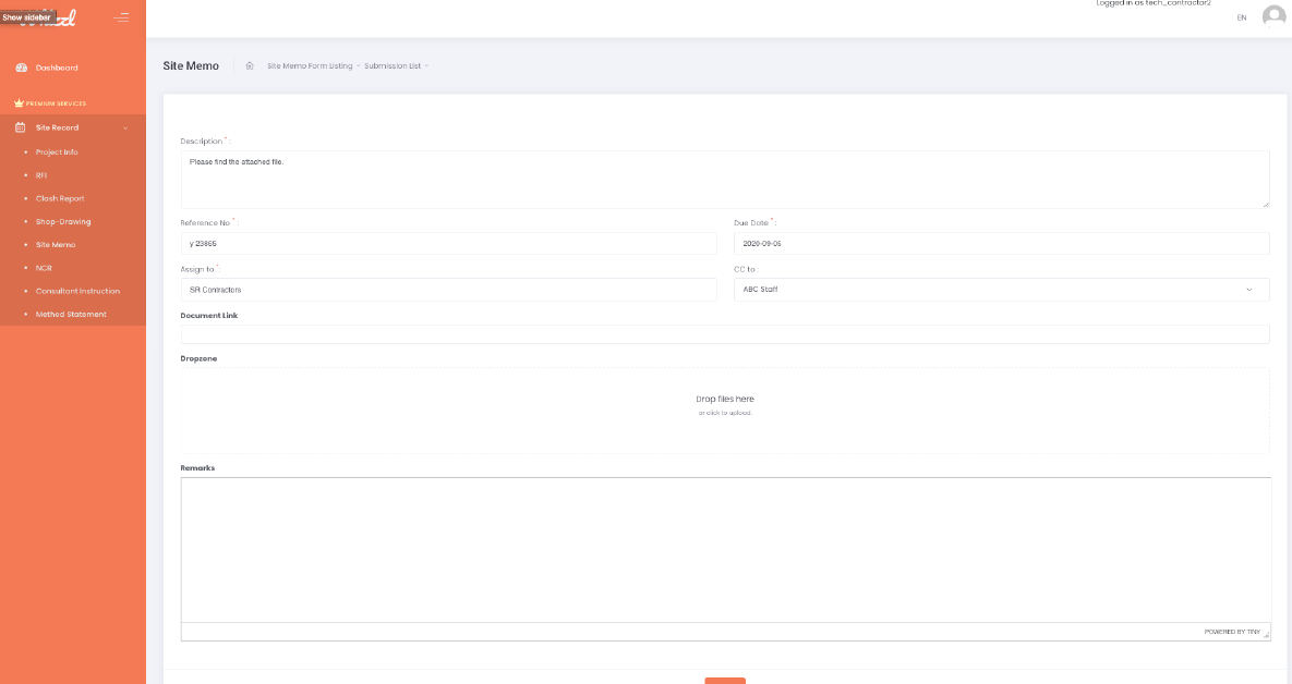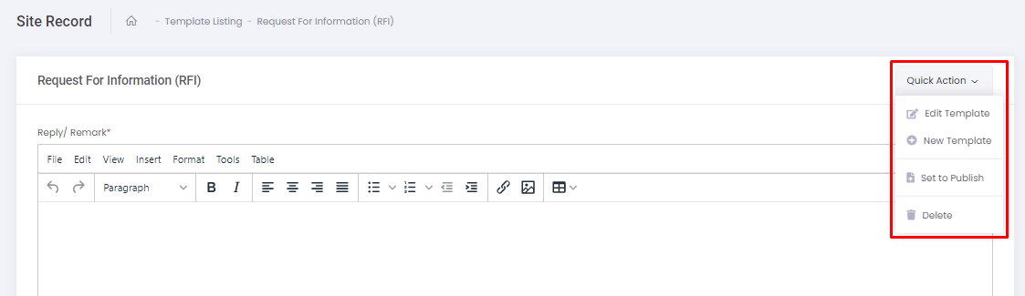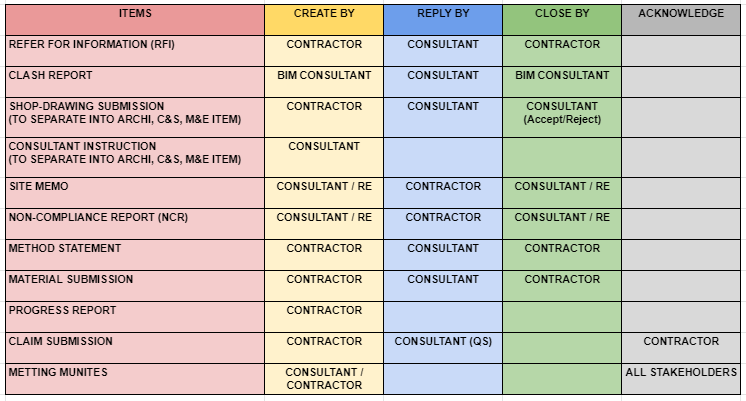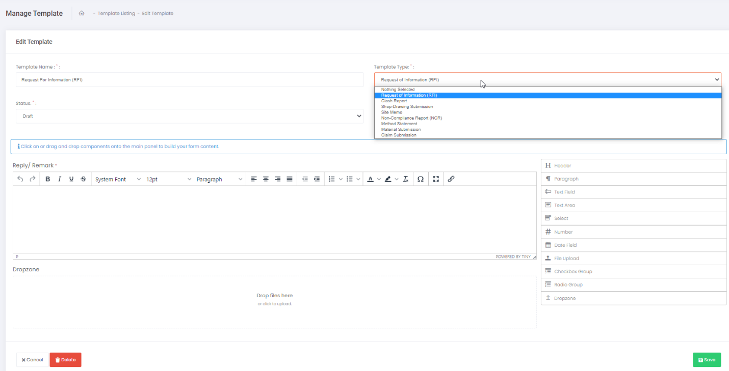 You can customize all the template forms for Request for Information (RFI), Clash Report, Shop-Drawing Submission, Site Memo, Non-Compliance Report (NCR), Method Statement, Material Submission and Claim Submission.