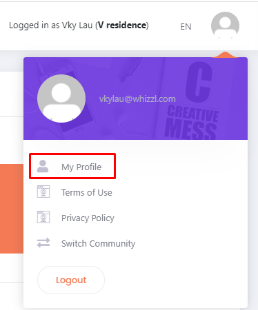 When you sign in to your Whizzl Account, in the top right, beside your login name there is a profile image icon displays. Click on the profile image, you can see “My Profile”, “Terms of Use” and “Privacy Policy”.