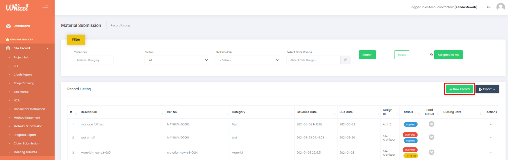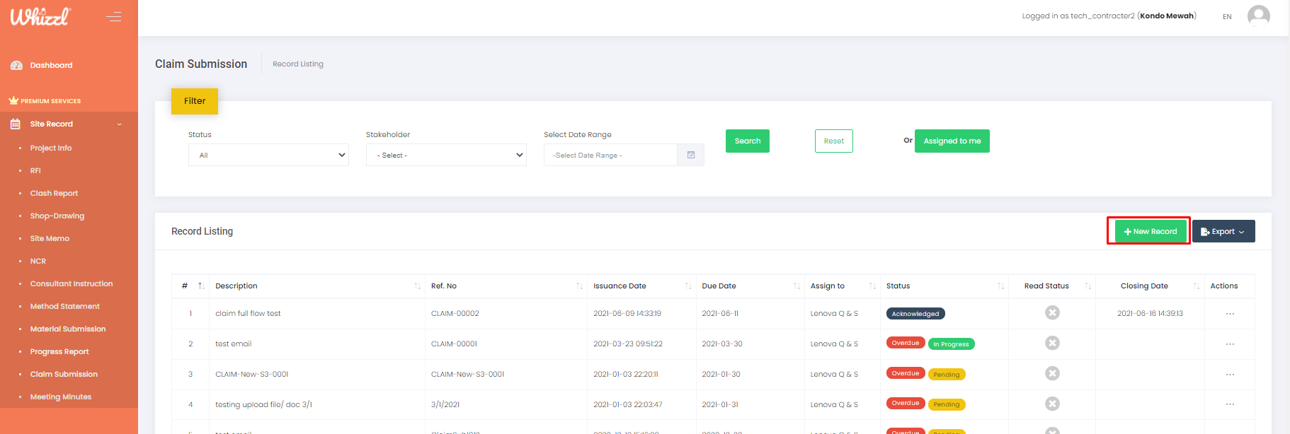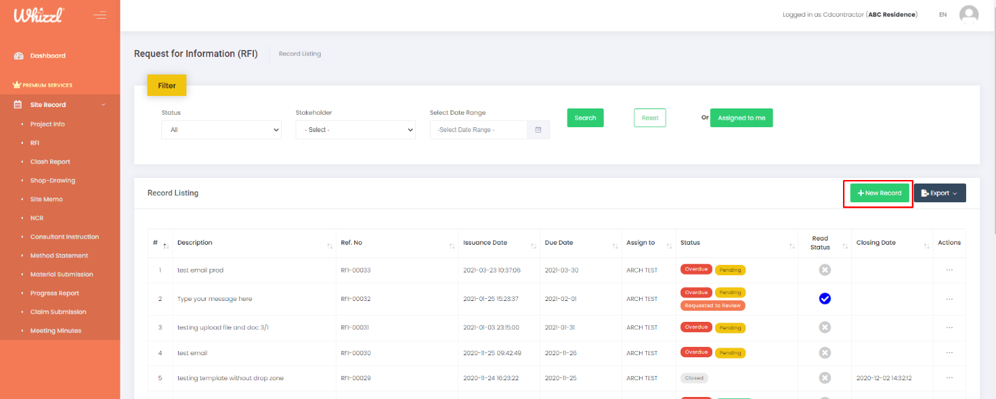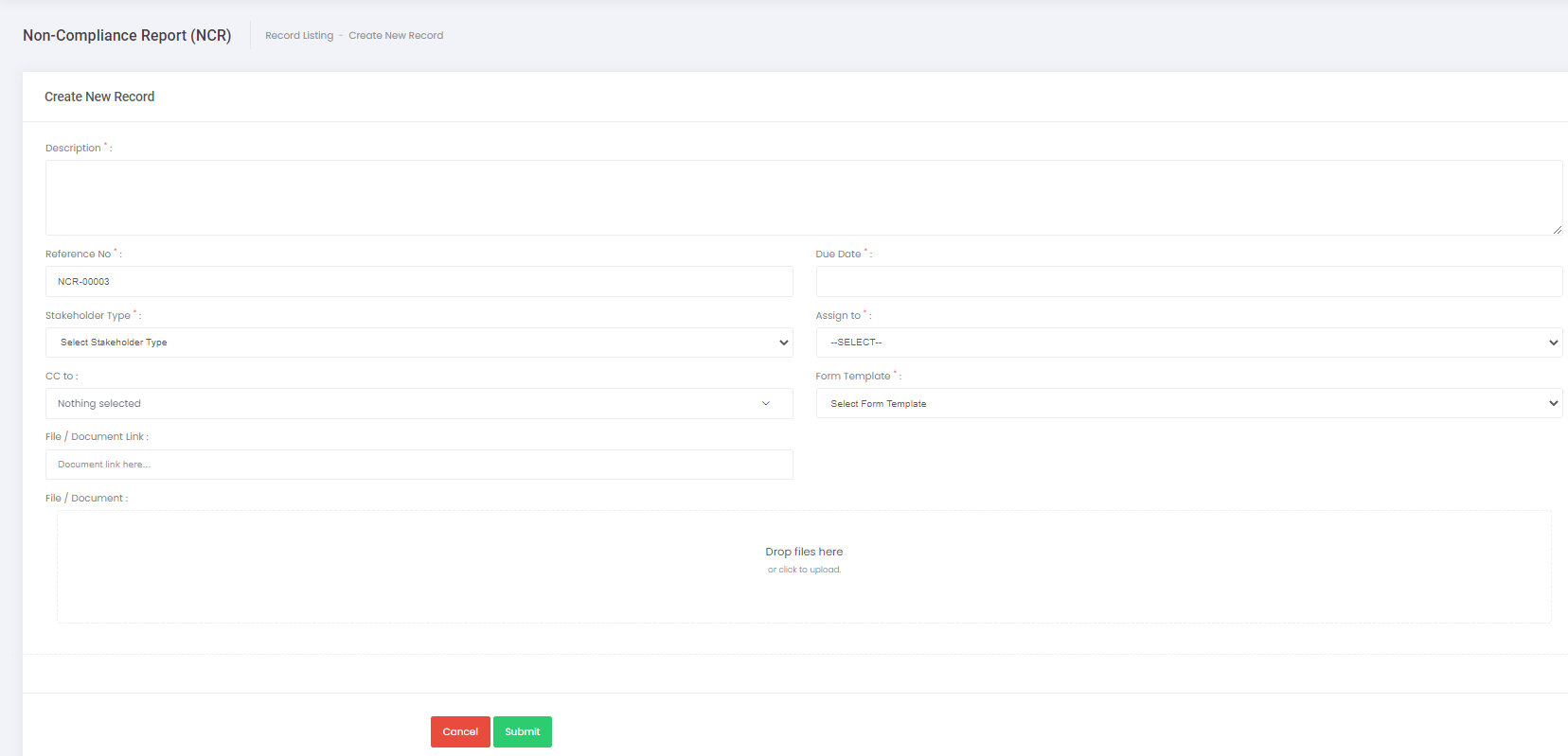 Step 1: Click on “+ New Record”.Step 2: You can create new record by selecting suitable template, stating your request, assigned to specific Stakeholder, cc to relevant Stakeholder(s), include file/document etc.