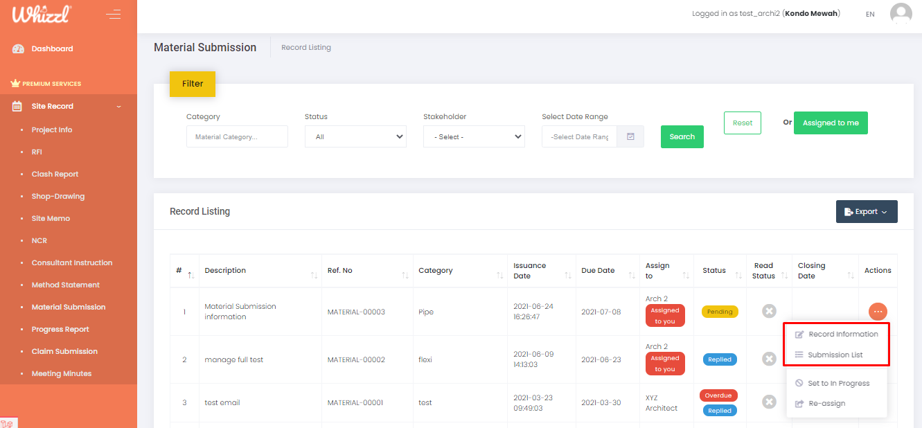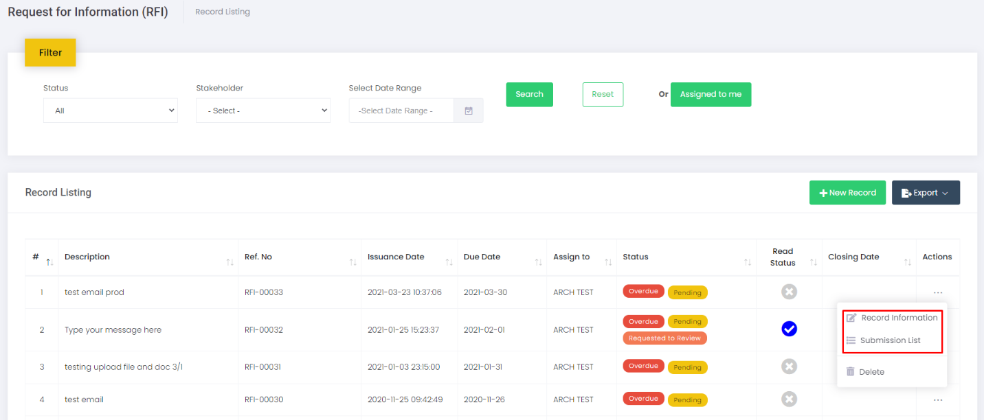 As Admin, you can review on each submission for each sub-module by clicking actions button “...” to view for record information or submission list.