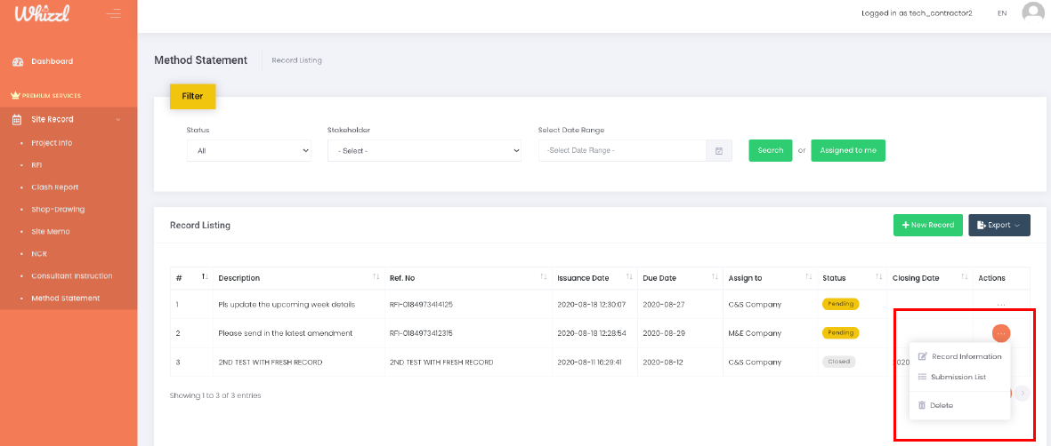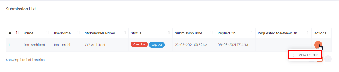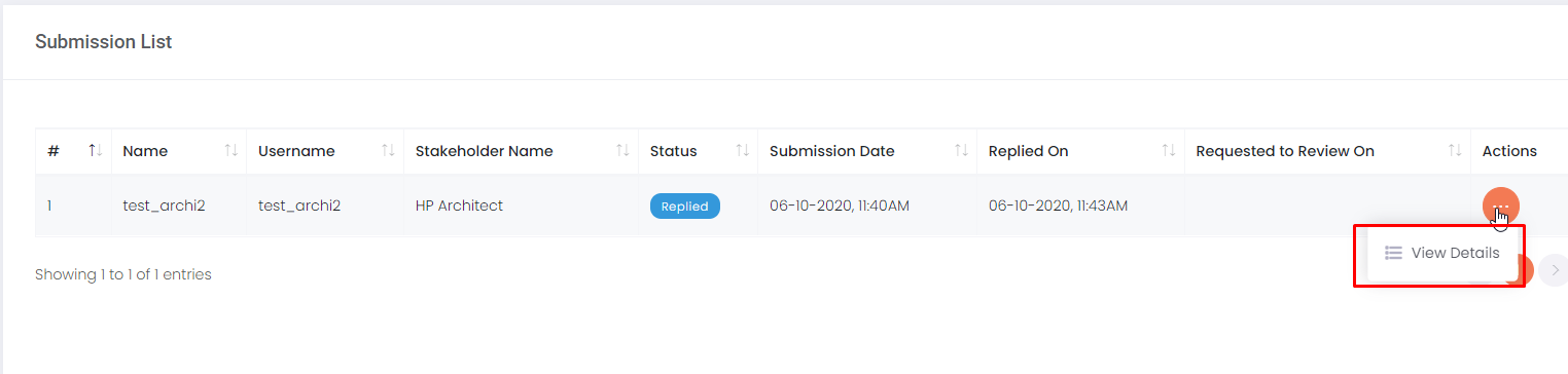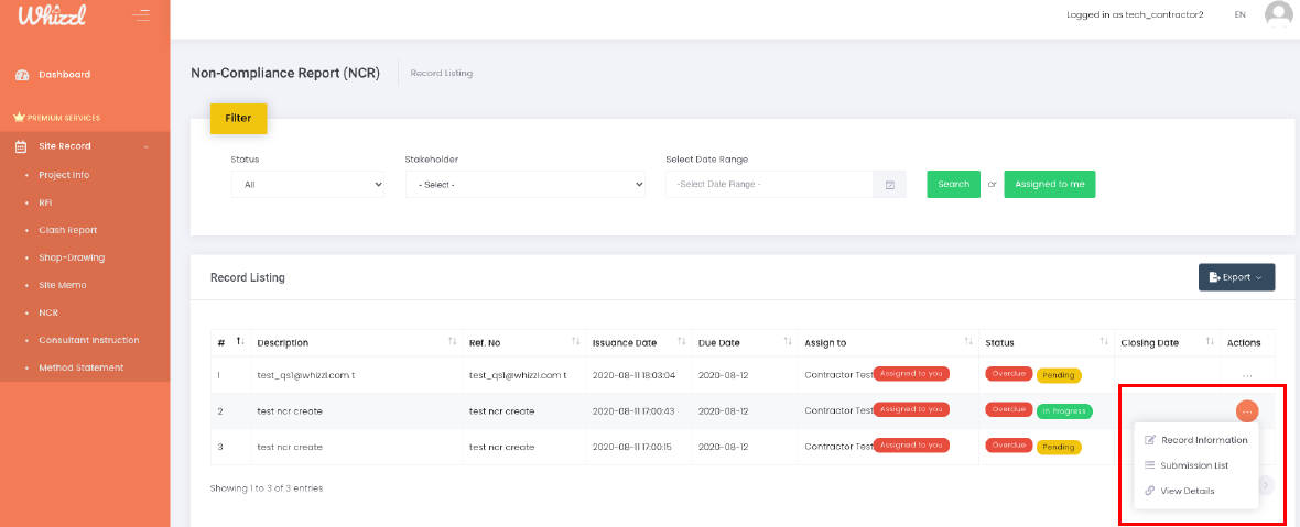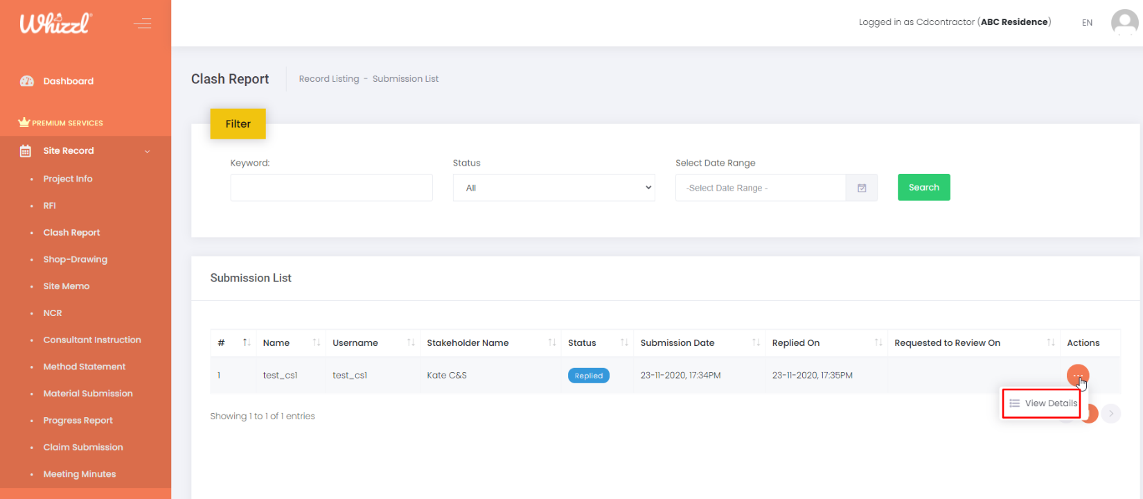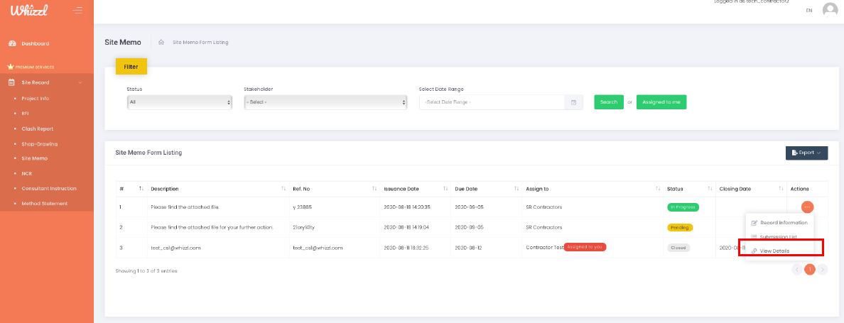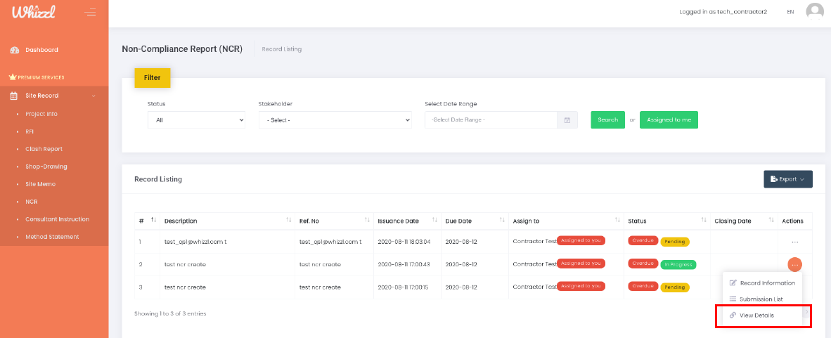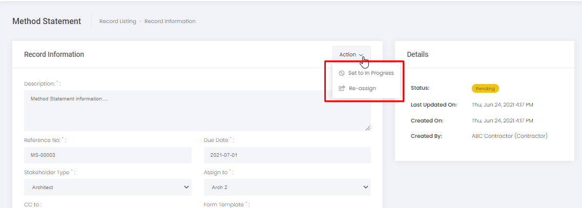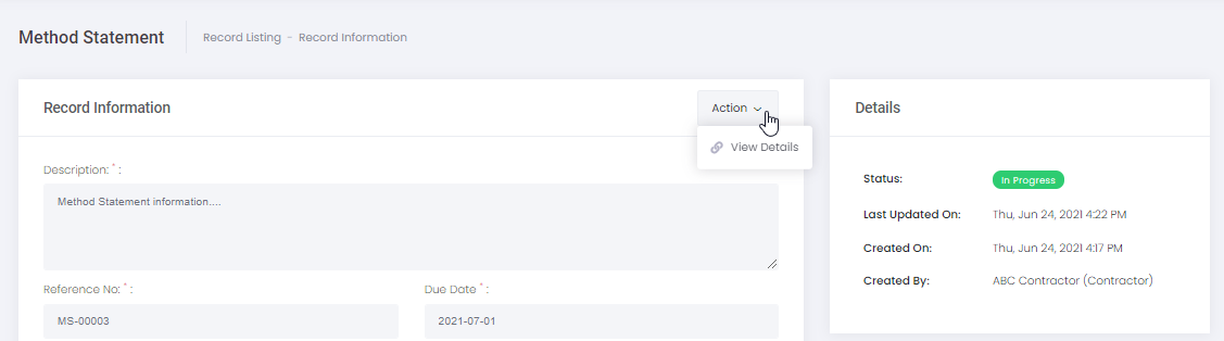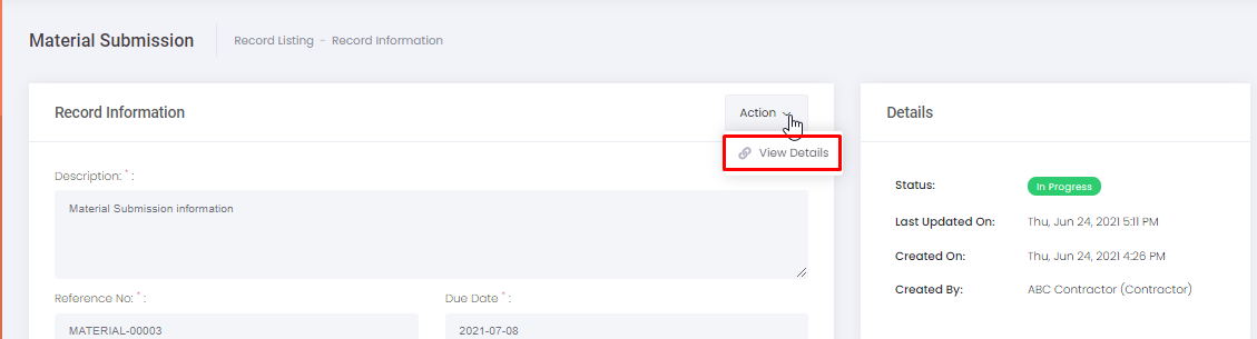 Step 2: Select the record that you wish to review and click on action button “…” to “View Details”. In the submission details, Contractor is allowed to take action on the record.