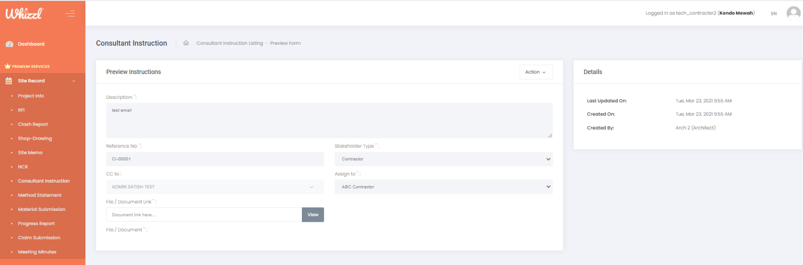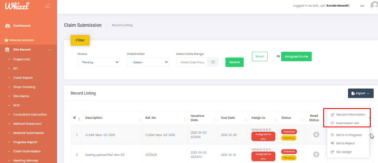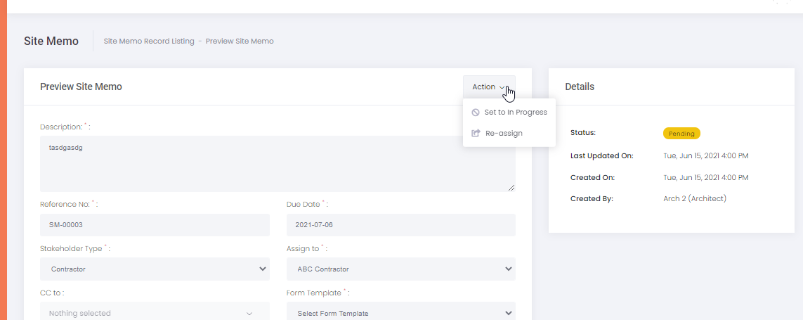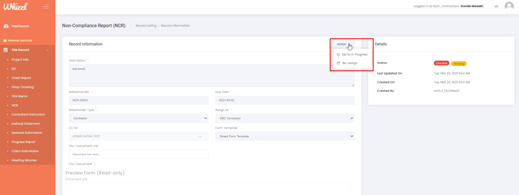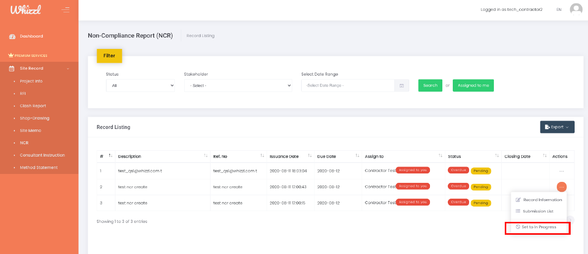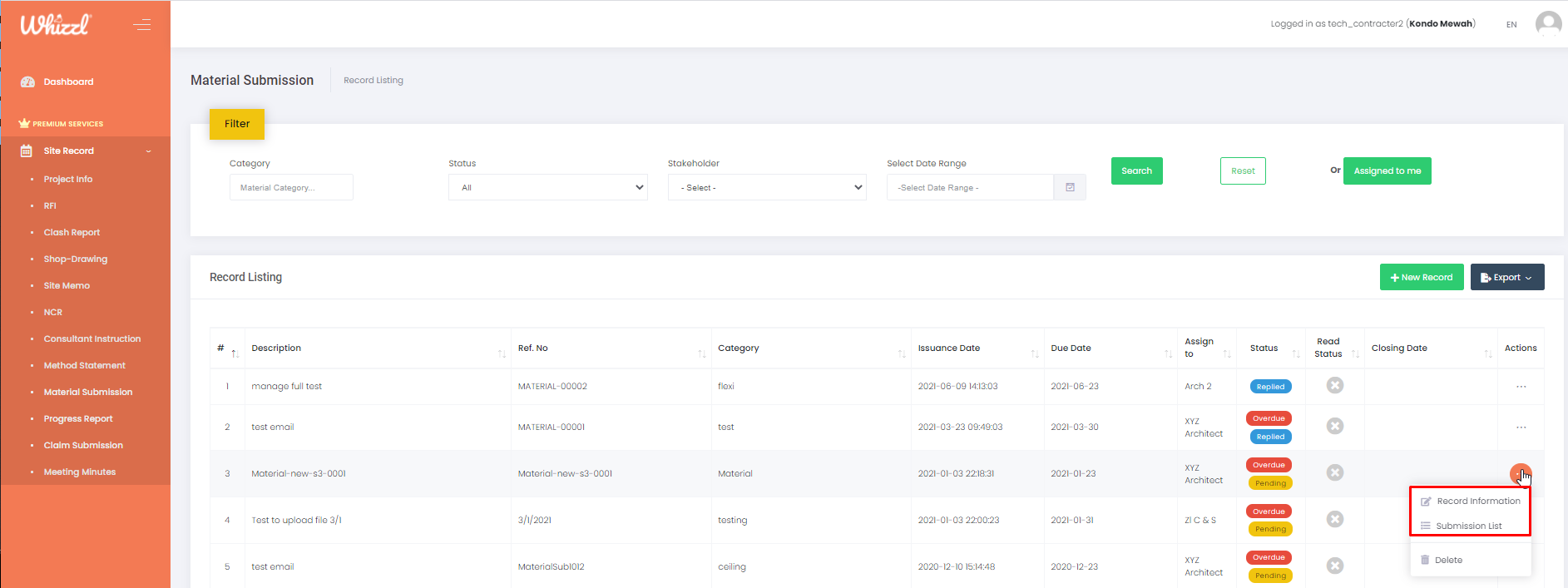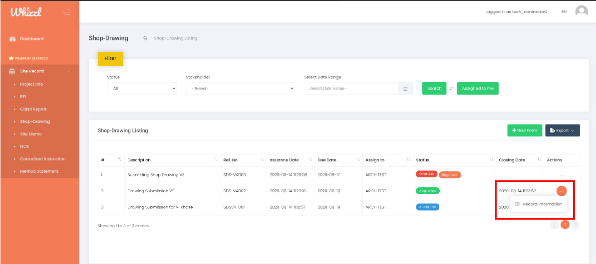Step 2: Select the record that you wish to review and click on action button “…” to “View Details”. In the submission details, Contractor is allowed to take action on the record.