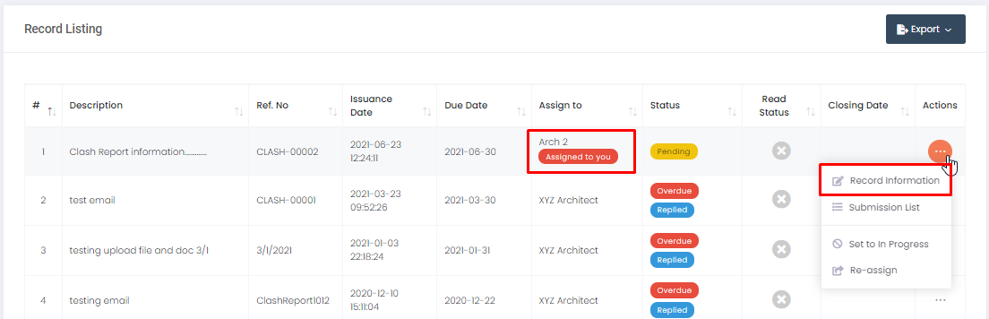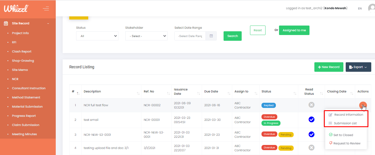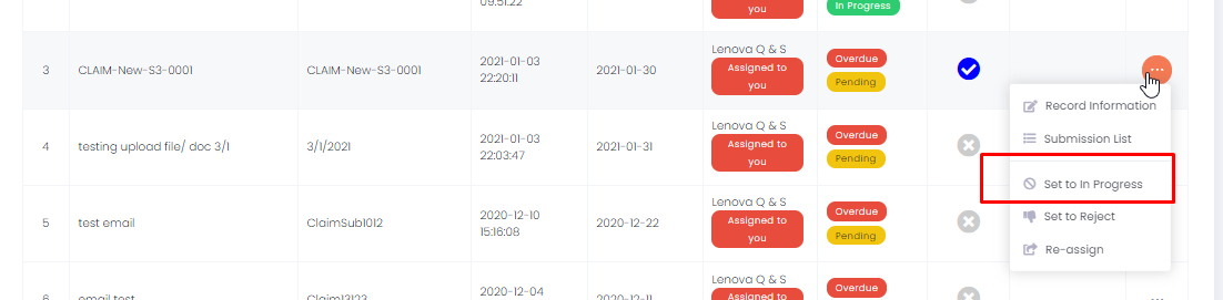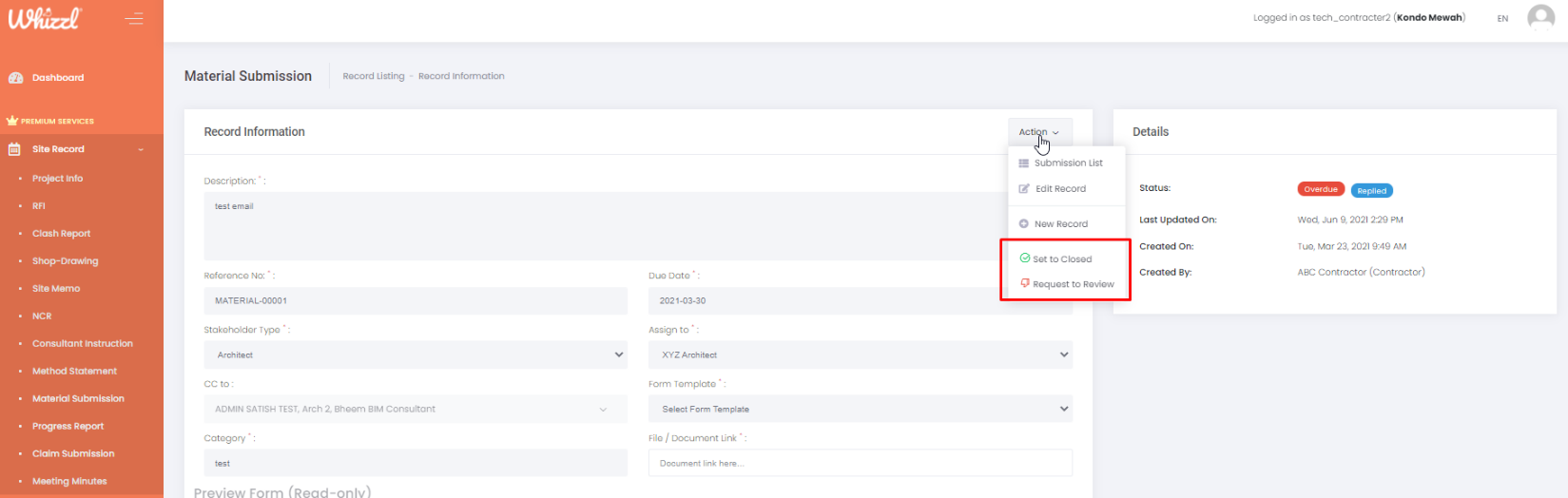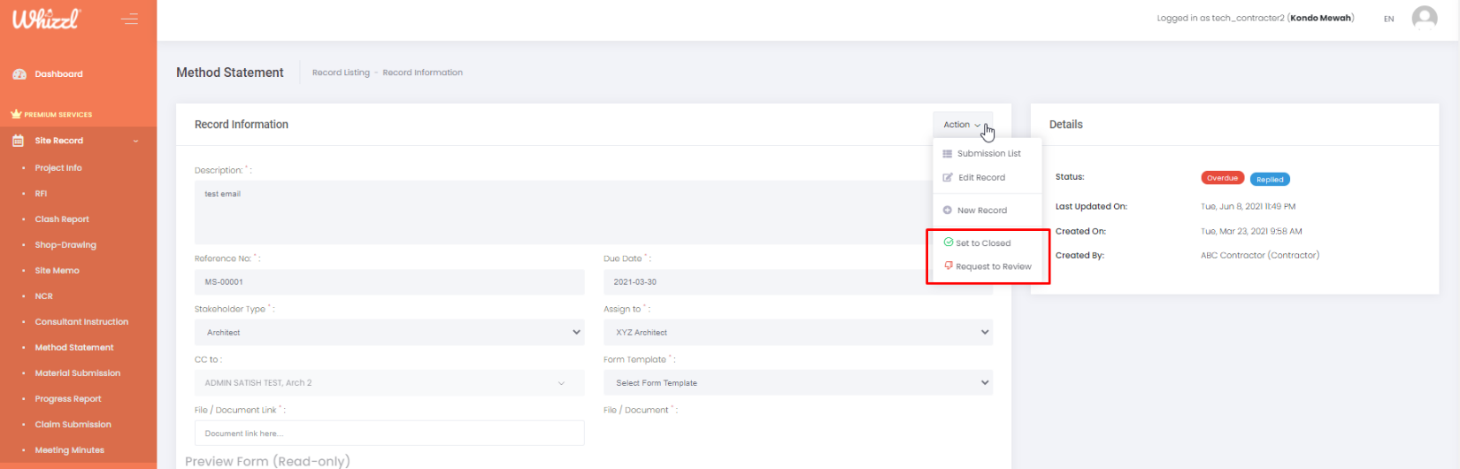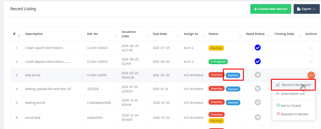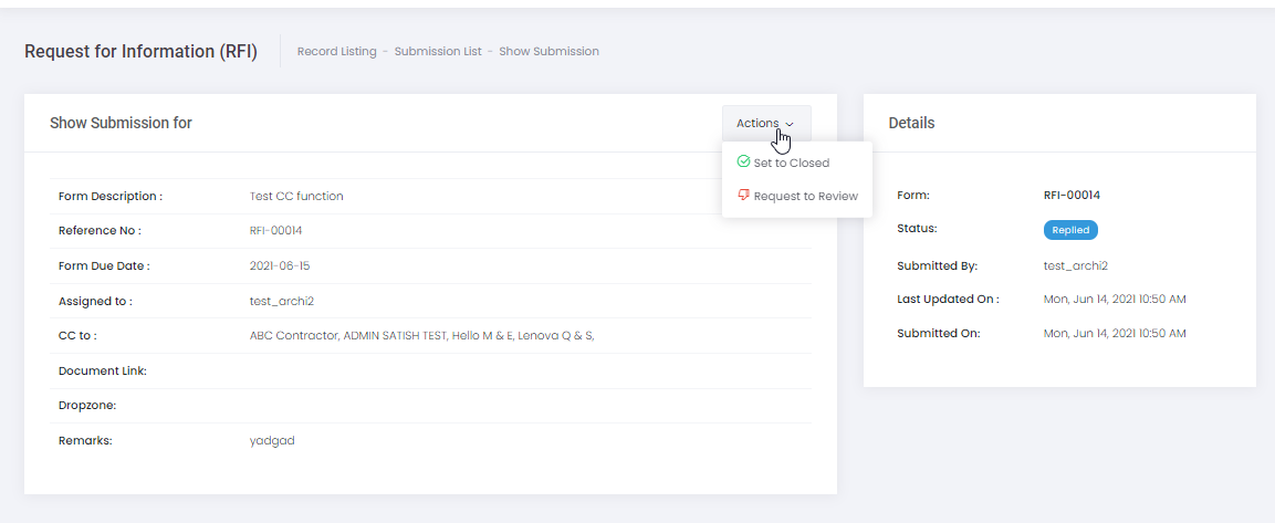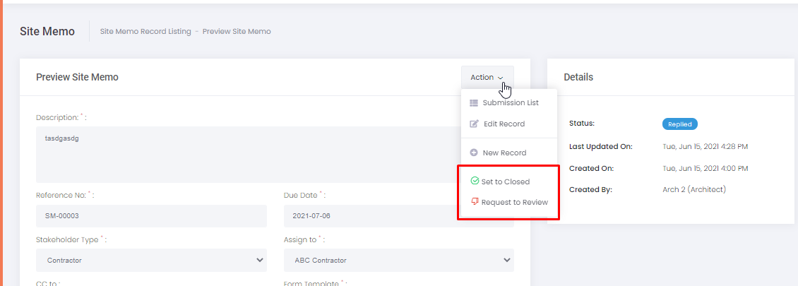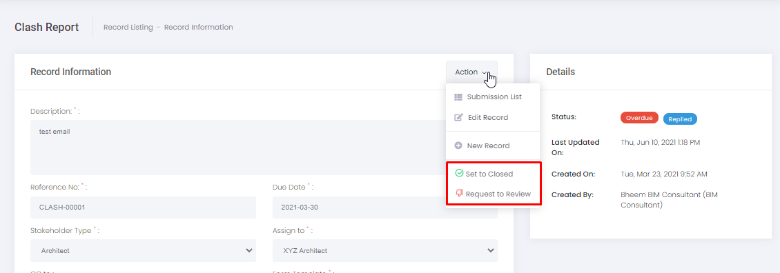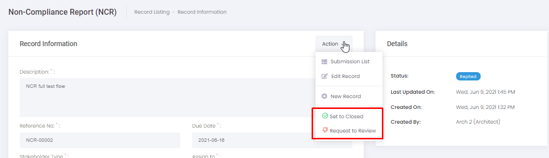Step 3: Click on “Actions”, it enables you to choose “Set to Closed” or “Request to Review” to change the record status.