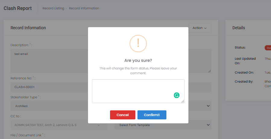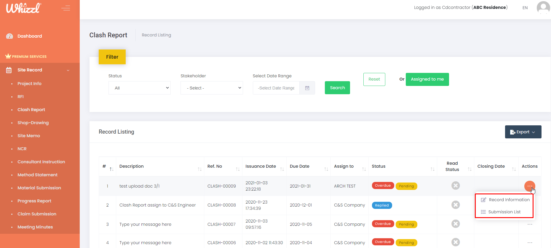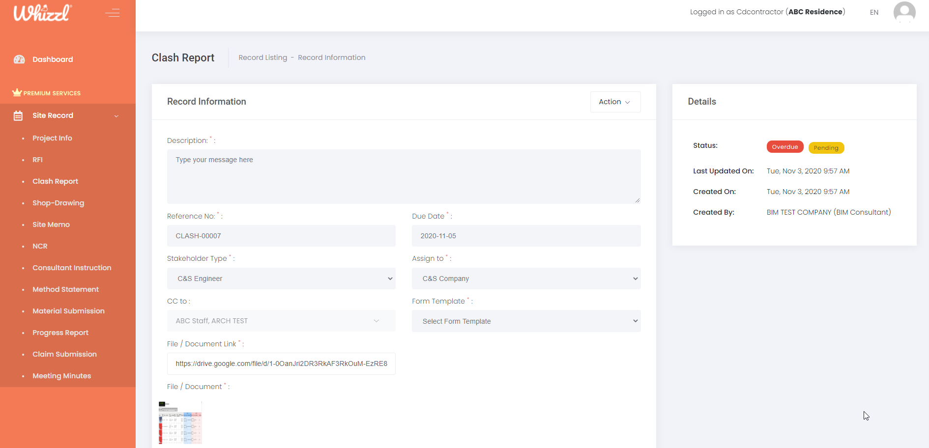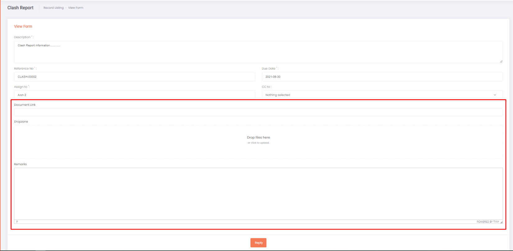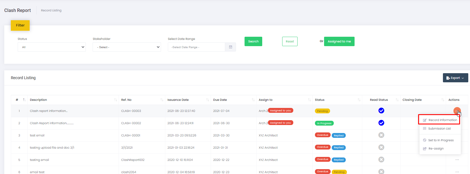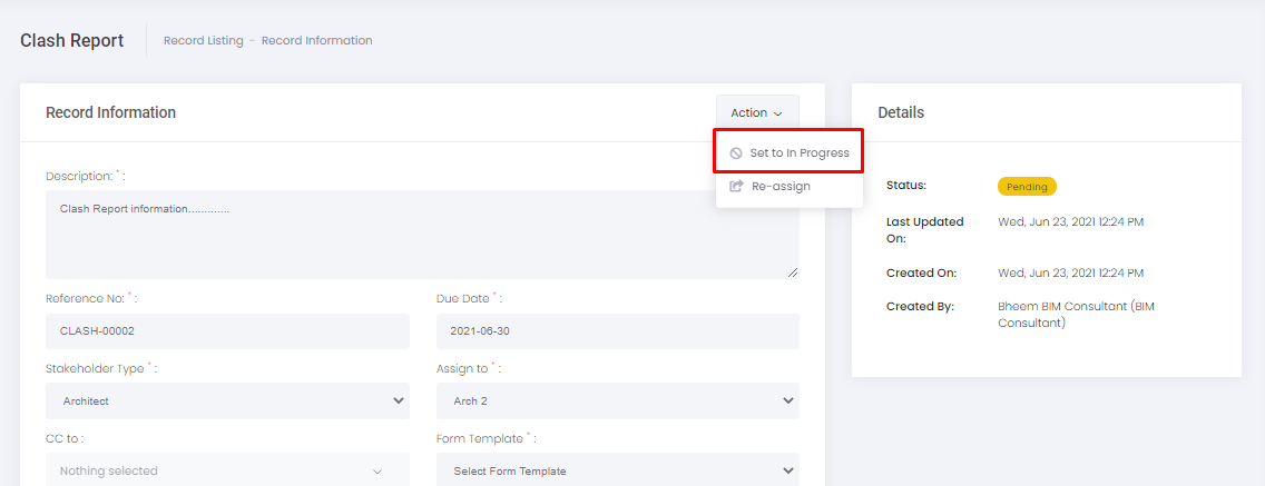 Clash Report is similar to RFI and it will be raised by BIM Consultant/BIM Coordinator. There is an indicator for the status in this sub-module, allowing the Contractor and other Stakeholders to know the status.