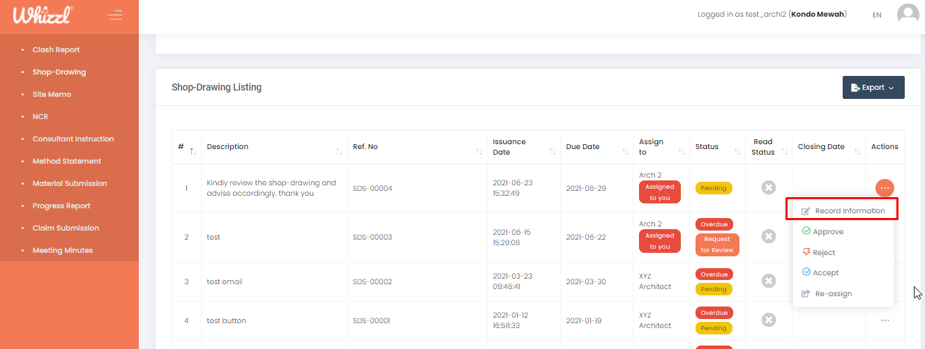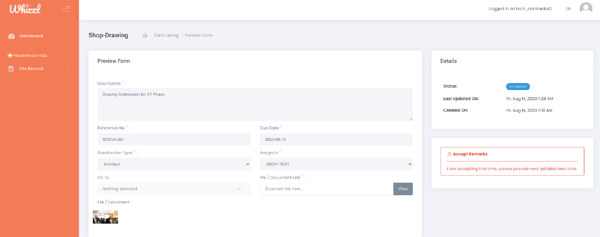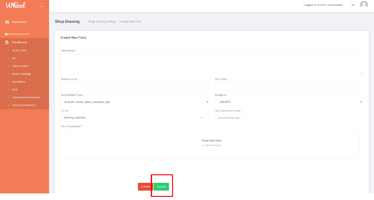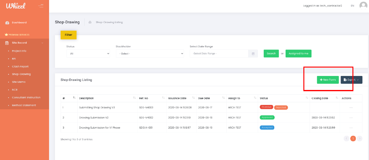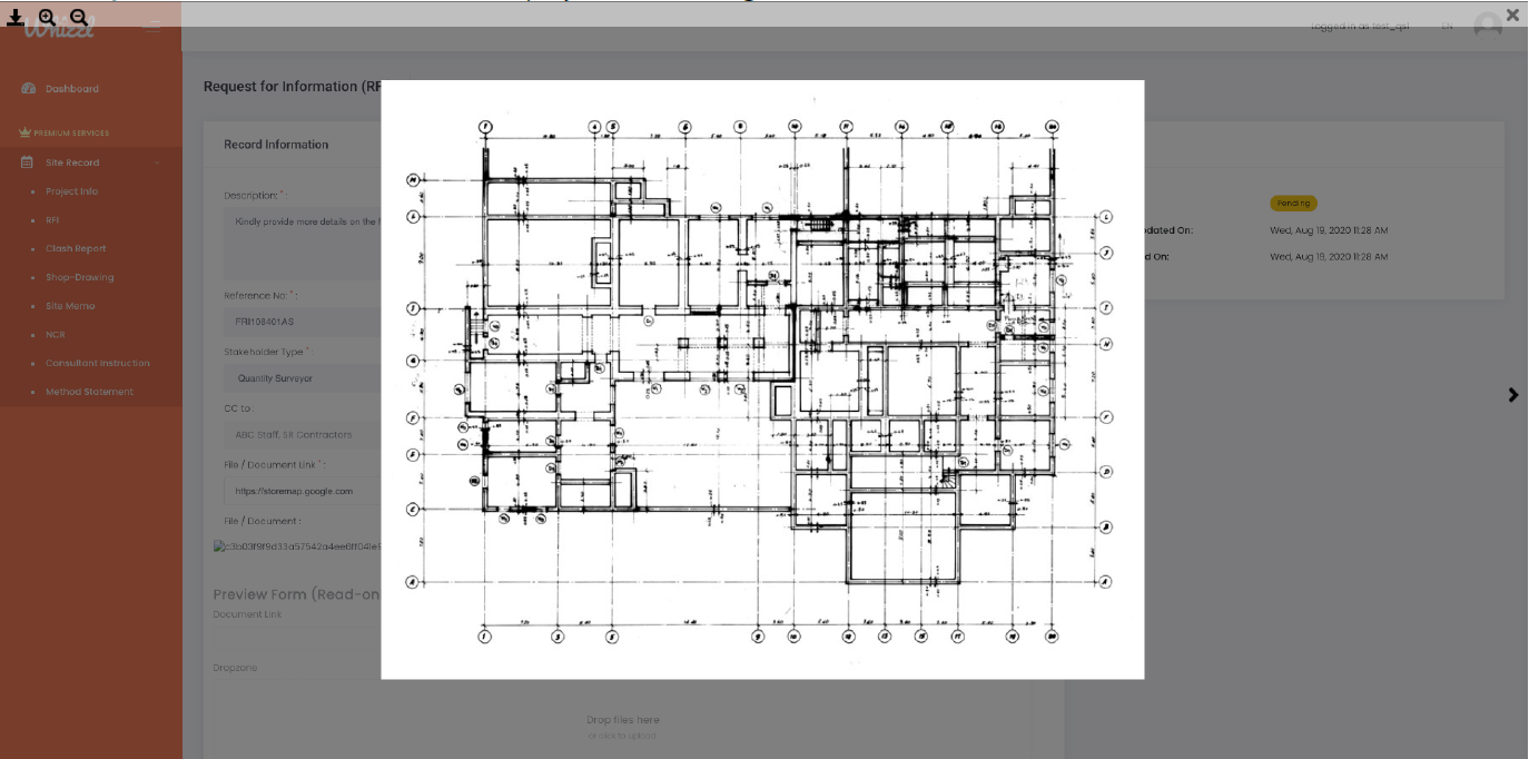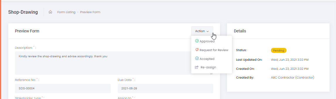 Shop-Drawing is produced by Contractors. The shop drawing is the Manufacturer's or the Contractor's drawn version of information shown in the construction documents. The Shop Drawing normally shows more detail than the construction documents. There is an indicator for the status in this sub-module, allowing the Contractor and other Stakeholders to know the status.