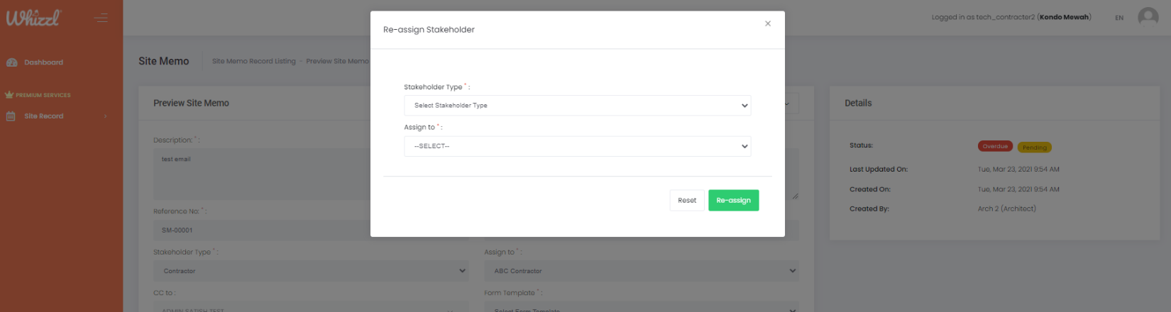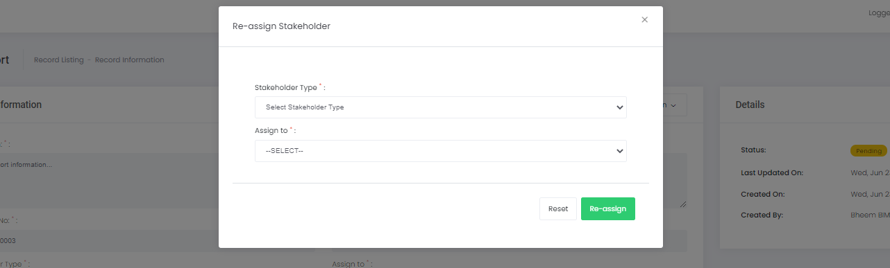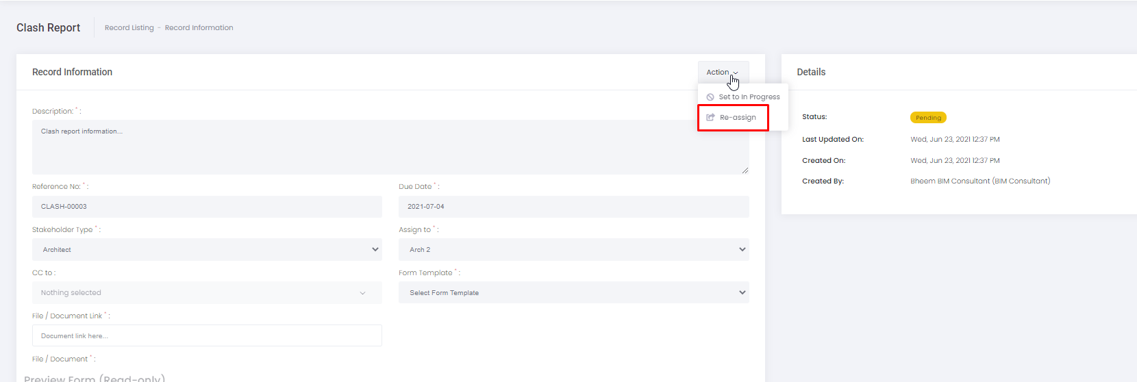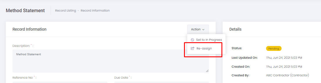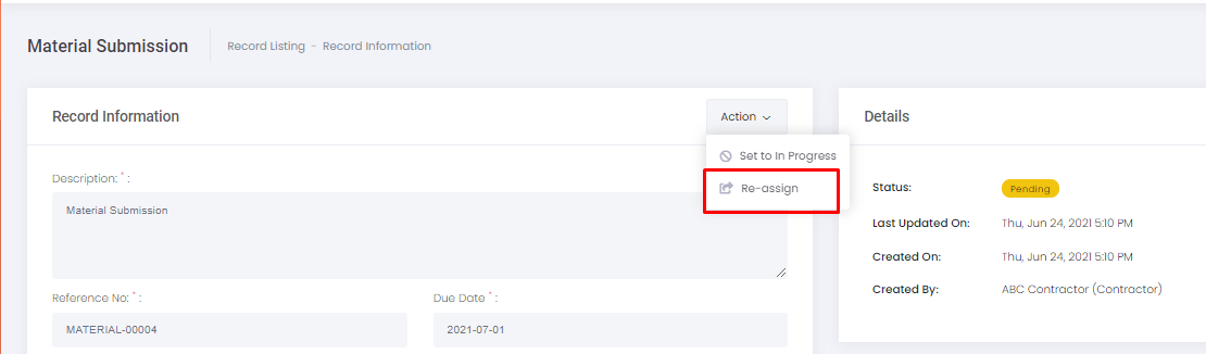 Step 1: In the record information, click “Actions”, select “Re-assign”.