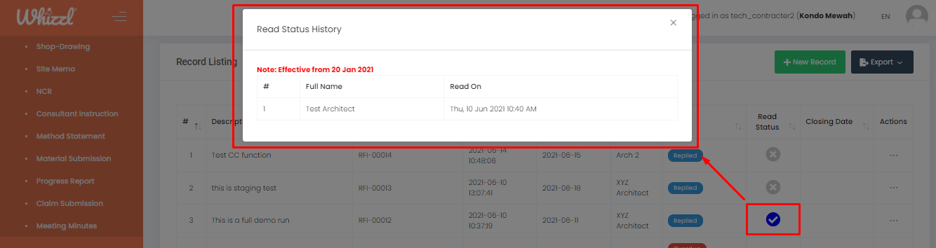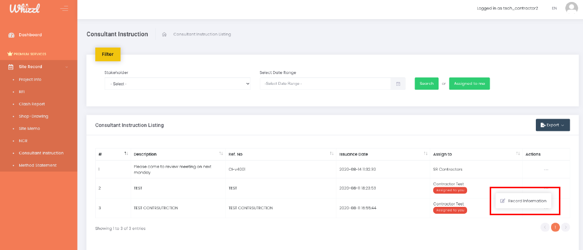 Request for Information which enable the Contractor to collect written information from related Consultants to gather information to take remedial steps. There is an indicator for the status in this sub-module, allowing the Contractor and other Stakeholders to know the status.