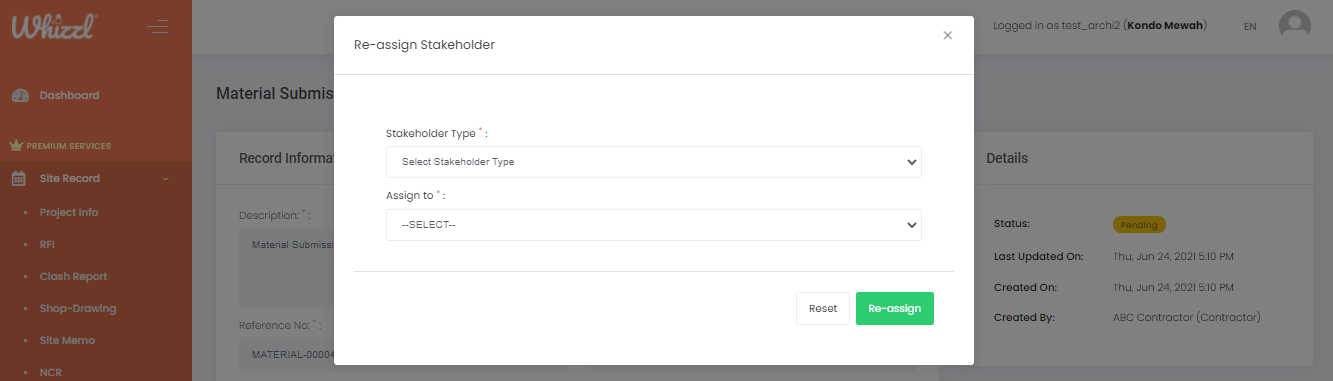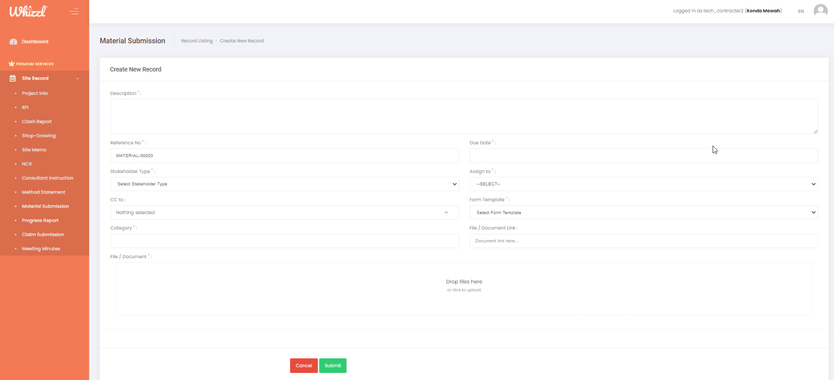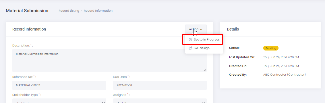 Material Submission in construction management are shop-drawings, material data, samples and product details that are primarily required for architects and engineers to verify that correct product specifications will be used for the specific project. There is a status indicator in this sub-module that allows the Contractor to check the status.