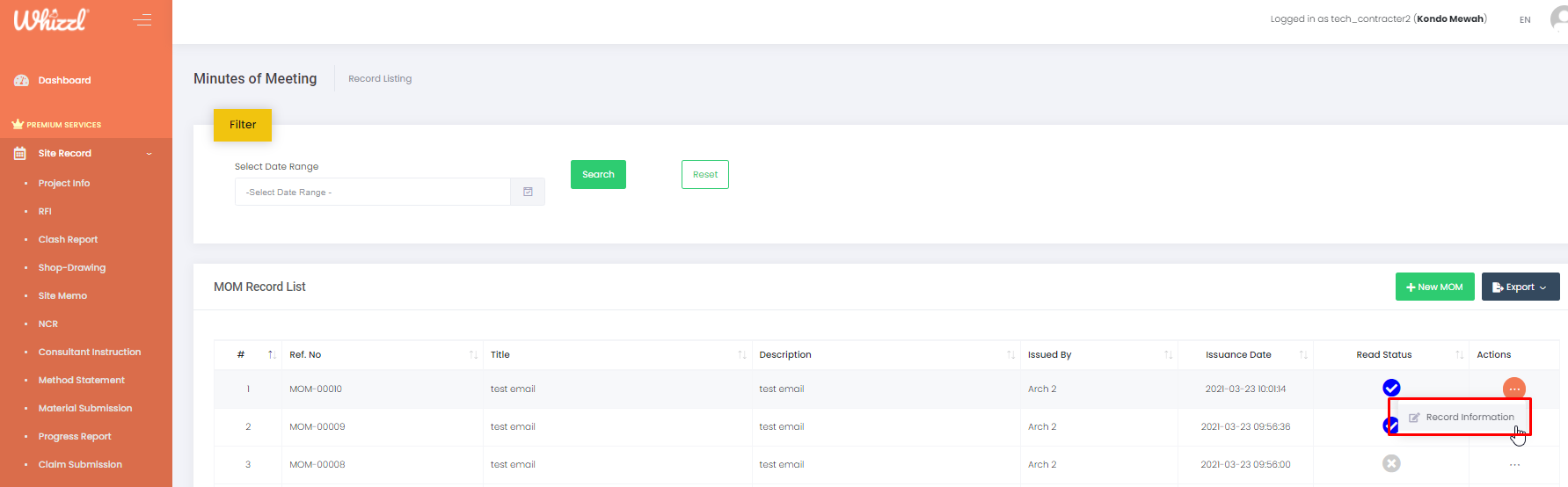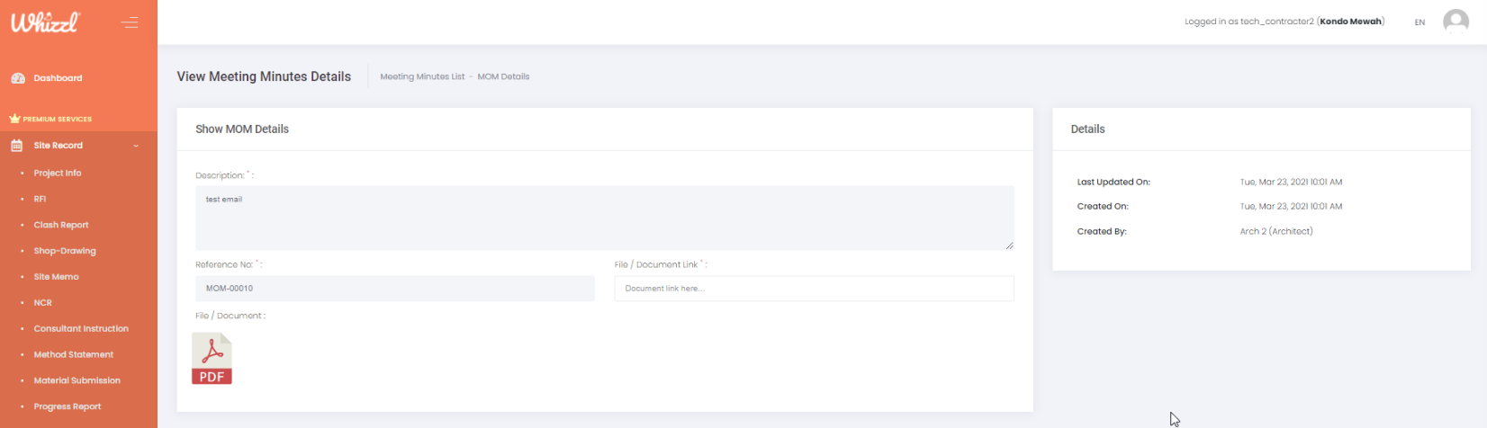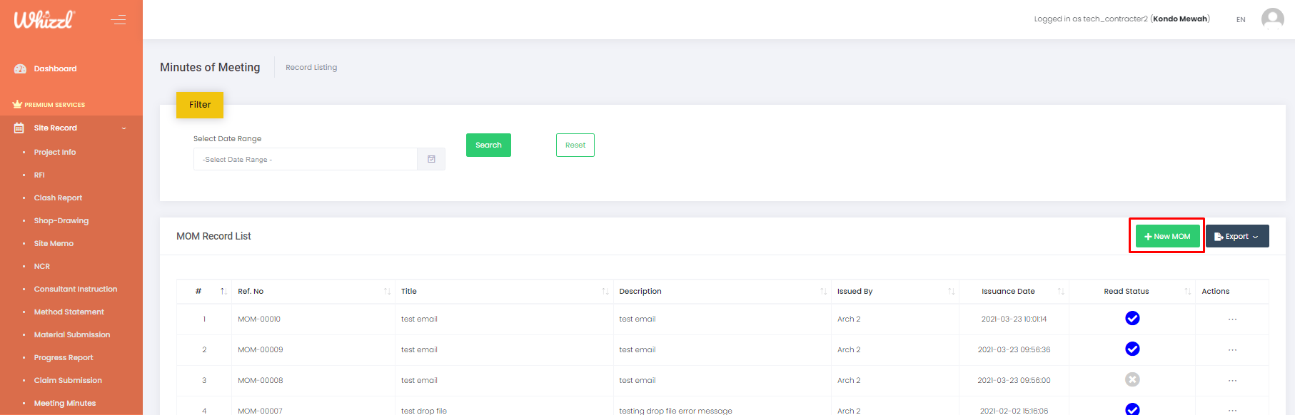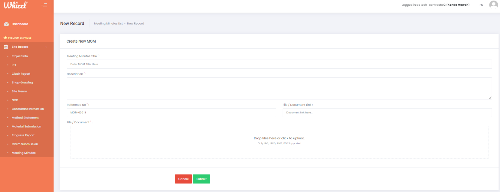 As a Contractor, you are allowed to create a new MOM record to all Stakeholders.
