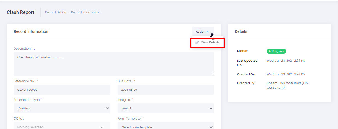 Step 2: When the record status changes to “In Progress”. Click again on “Actions”, select “View Details”.