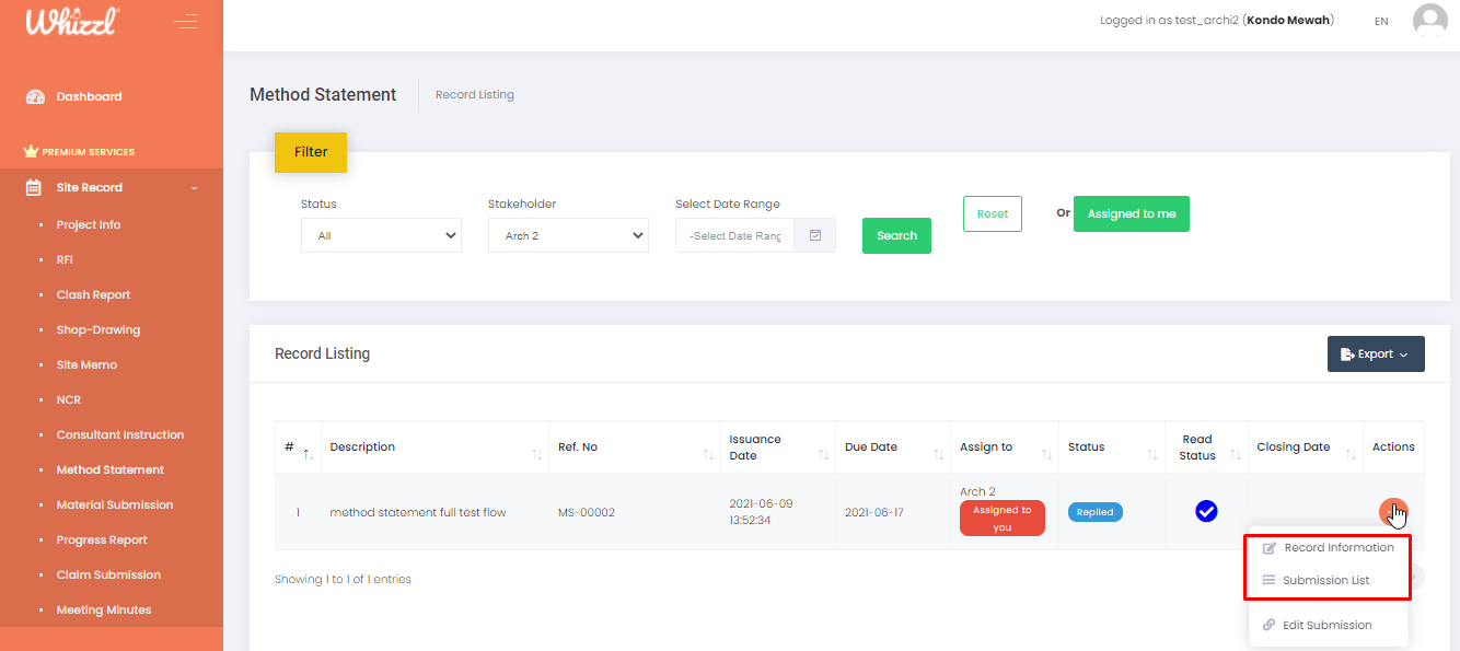As an Admin, you can review each submission for each sub-module by clicking action button “...” to view record information or submission list.