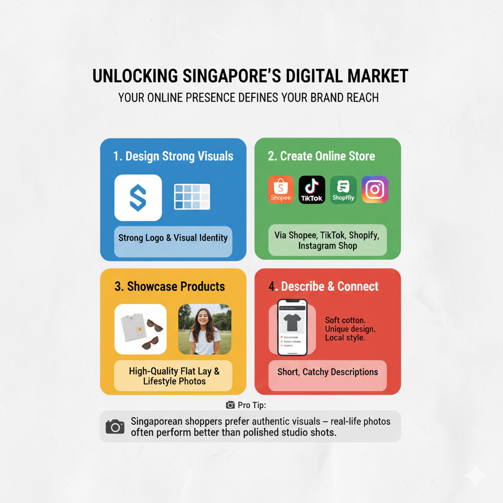 Singaporean shoppers prefer authentic visuals — real-life photos of people wearing your shirts often perform better than polished studio shots.