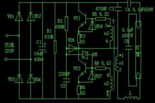 The ballast's initial oscillation frequency is 30-40kHz. VT1 and VT2 alternately conduct to provide high-frequency oscillation energy to the fluorescent tube. The fluorescent tube's filament is connected in series in the oscillation circuit. In the initial stage of circuit oscillation, the filament receives preheating energy. Before the tube is lit, capacitor C5 and inductor L form a series resonant circuit. During oscillation, the high-frequency high voltage output of the oscillation circuit is applied to the series resonant circuit. When the circuit reaches resonance, the voltage across the ballast inductor L and the resonant capacitor is higher than the voltage applied to the series resonant circuit, reaching over 300 volts. This high-frequency high voltage applied to the tube causes it to ignite rapidly. After the tube is lit, its internal resistance decreases. Because the tube is connected in parallel across the resonant capacitor C5, the Q value of the series resonant circuit drops rapidly as the fluorescent tube is turned on and lit, disrupting the resonance (circuit detuning). The local oscillator frequency decreases from 30Hz to about 15Hz, and the voltage across the tube drops to about 100V. In this case, the unsaturated leakage flux ballast inductor L only serves as a ballast, maintaining the lamp's ignition.