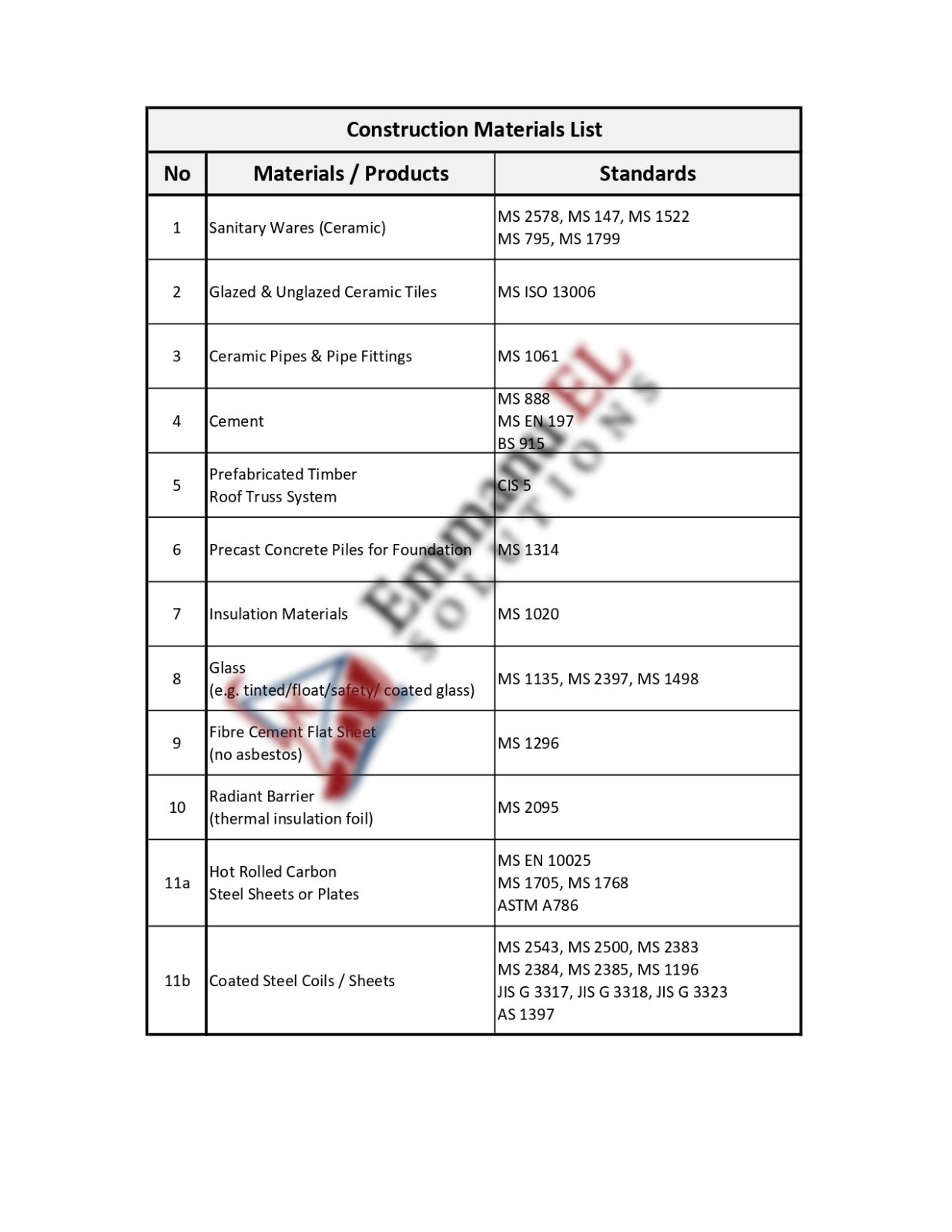 The Construction Materials List image above shows the materials subject to mandatory e-Invoice reporting under Malaysian tax regulations for the construction sector.