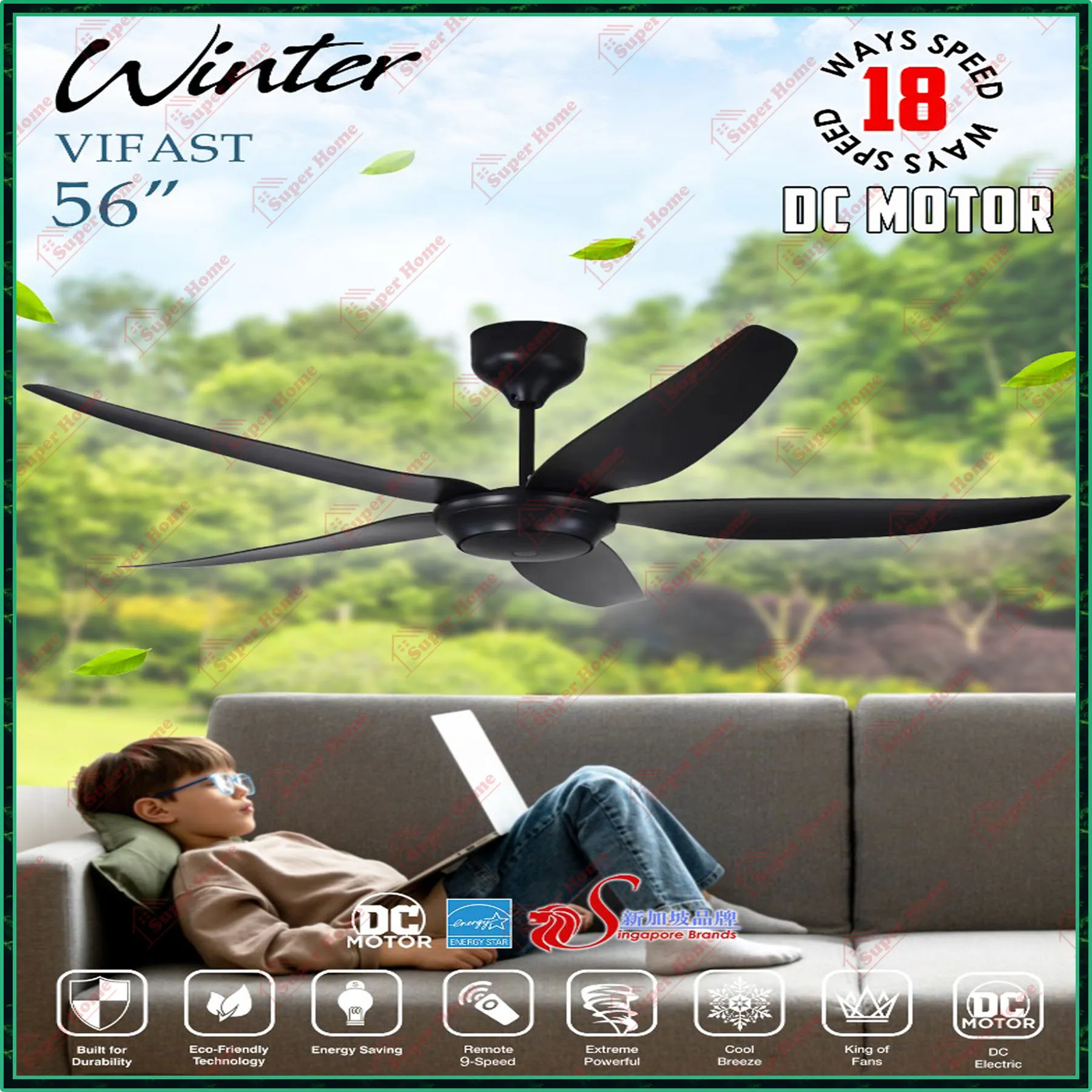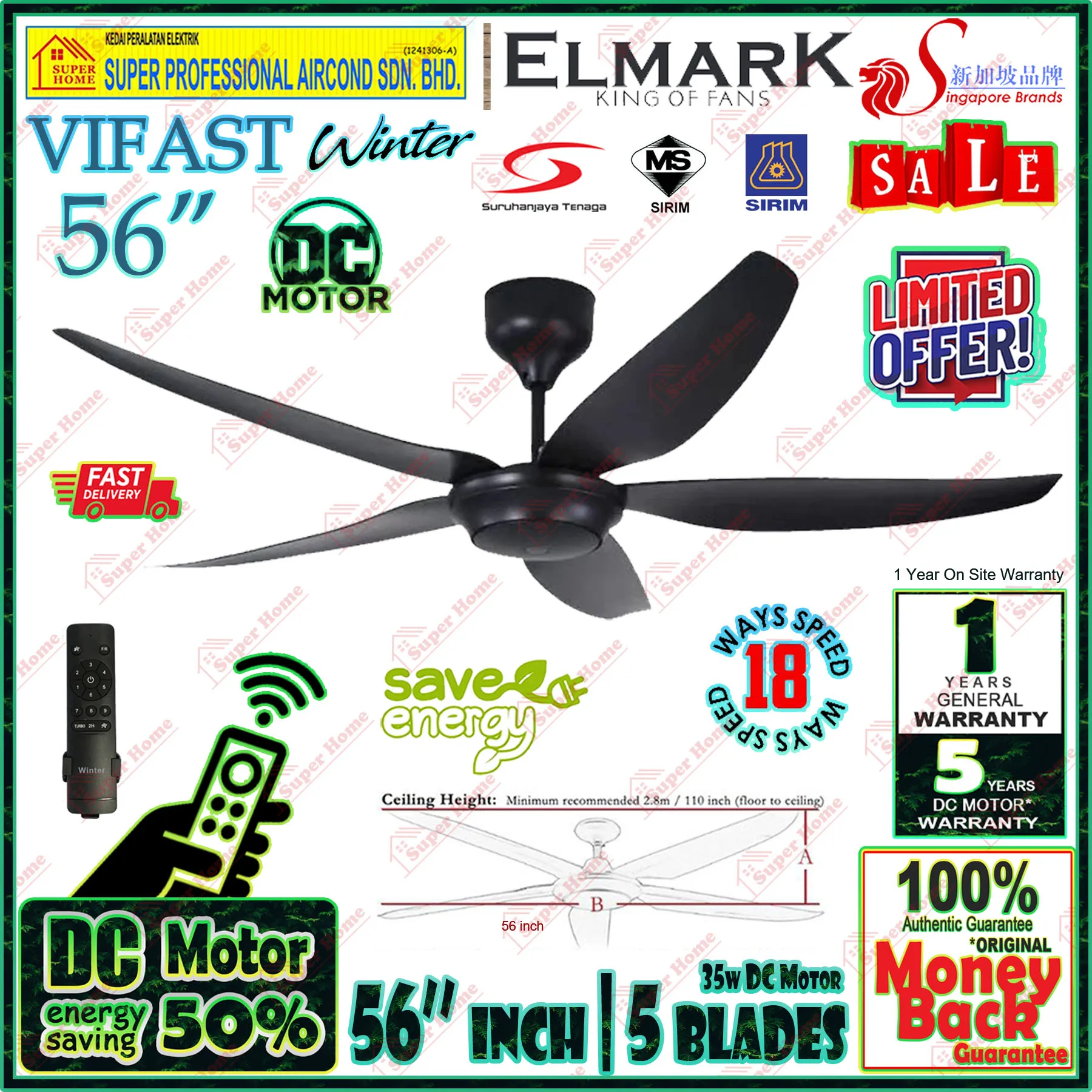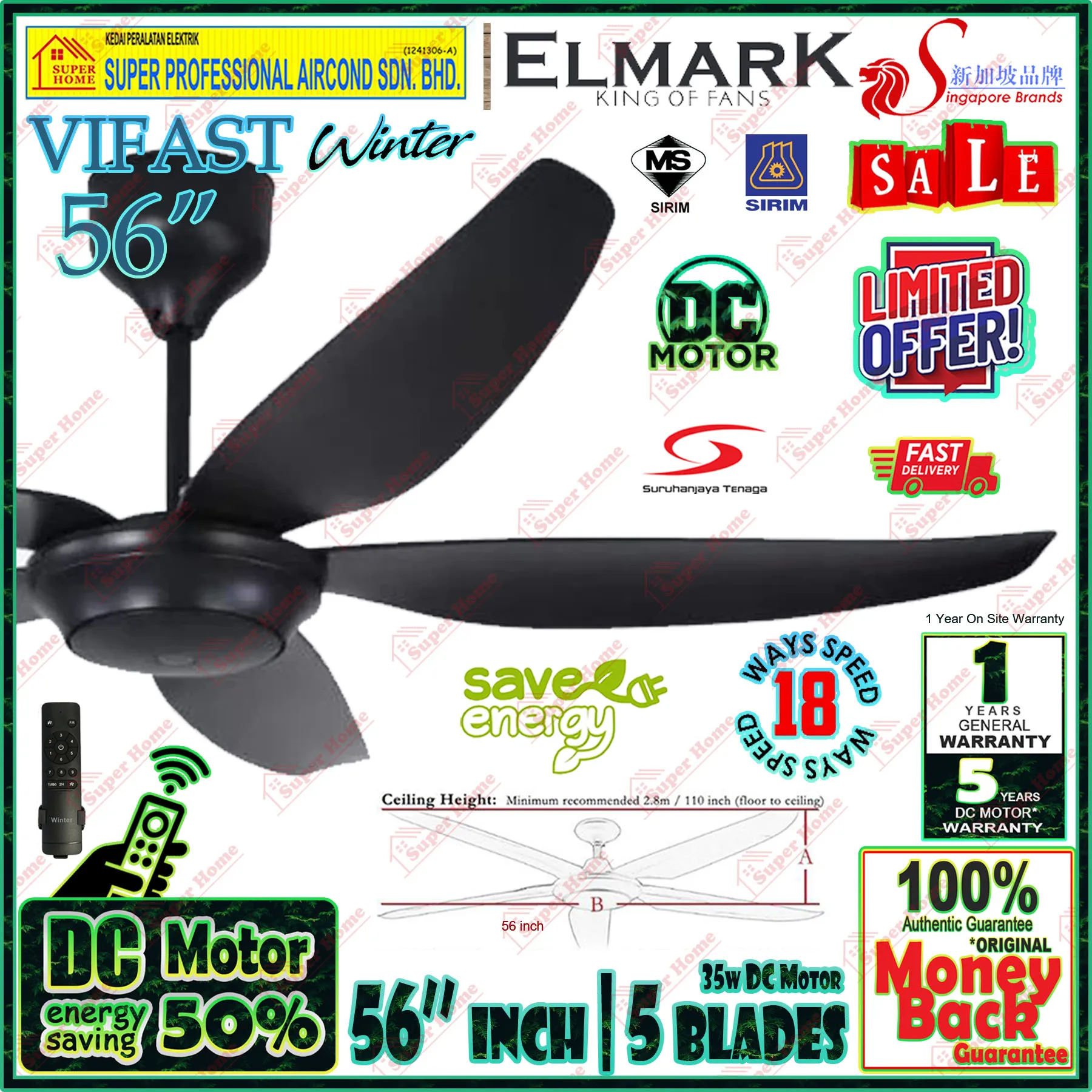Selangor,Kuala Lumpur (KL),Petaling Jaya - Elmark DC Motor Ceiling Fan Vifast Winter 56 inch Ceiling Fan with Remote Control (5 blades) Black