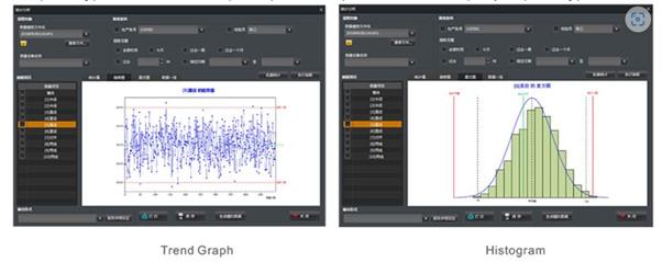 The trend graph displays the regular trend of the measured values, such as the monotonic and periodic change of the measured values, which can be used for monitoring the abnormality of the production process of producing equipment. Reflecting the status and distribution of fluctuations in product quality, the histogram can intuitively expose information about the quality situation in producing process, which can be used to predict product quality and failure rate.