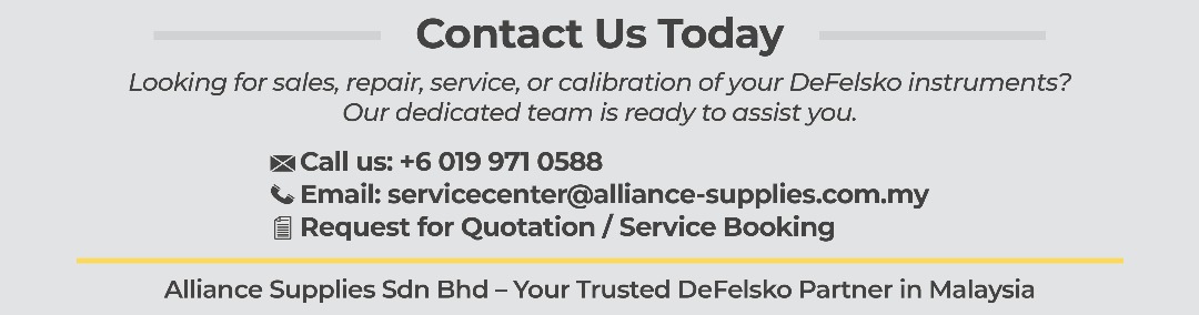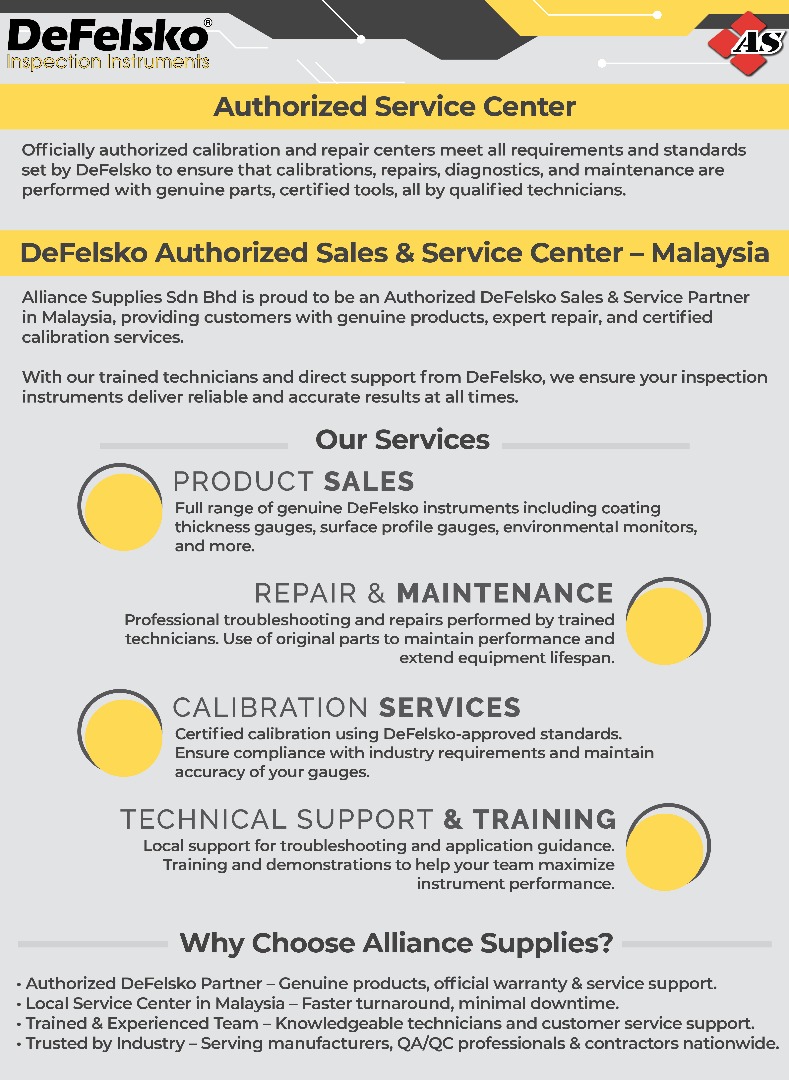 Alliance Supplies Sdn Bhd is proud to be an Authorized DeFelsko Sales & Service Partner in Malaysia, providing customers with genuine products, expert repair, and certified calibration services.