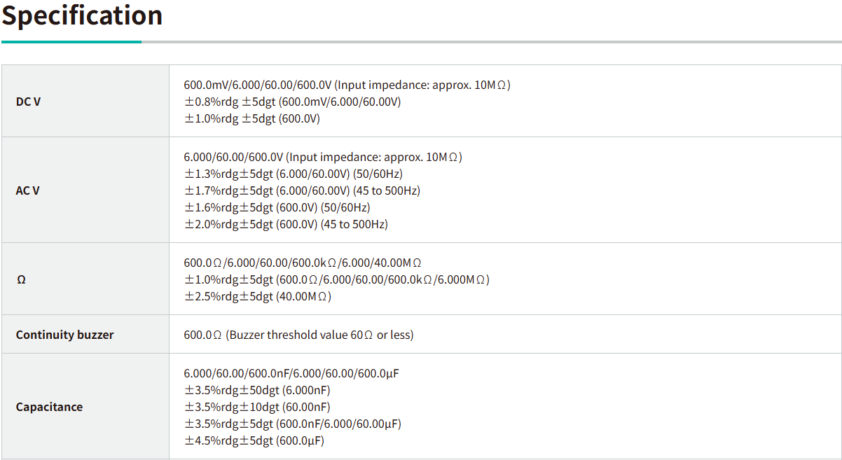 - DCV, ACV, Ω, Capacitance Measurement