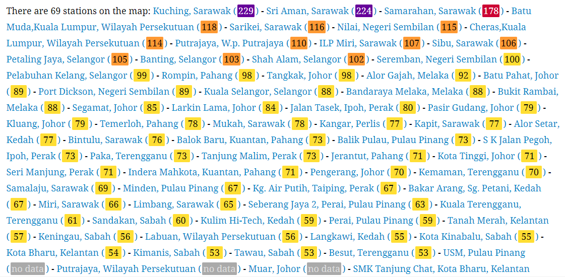 根据《环境局》官网陈列的数据显示,截至98日下午5时,全国68个地区里,共有3个地区呈非常不健康水平,分别是斯里阿曼(243点),三马拉汉(202点)及古晋(224点)。根据气象局的网站数据显示,截至97日,古晋已连续10天没有降雨,斯里阿曼及三马拉汉则是连续7天没有降雨。