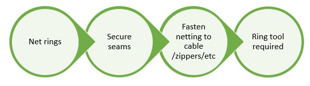 Net rings secure seams and fasten the netting to the cable, zippers, etc. Ring Tool required.