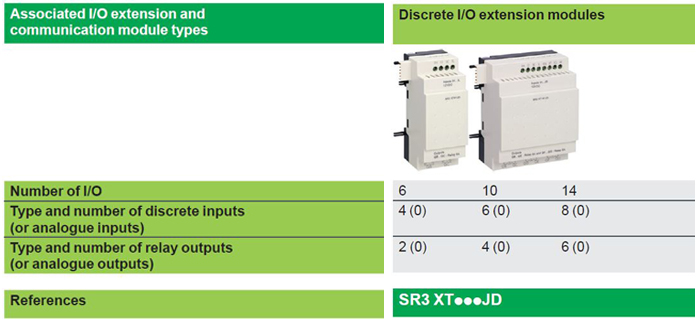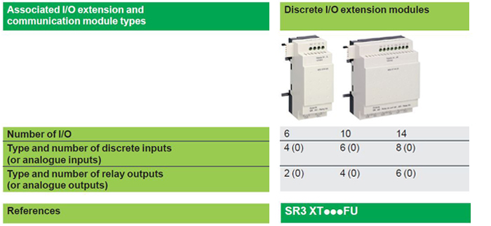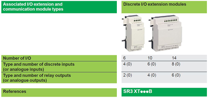 • 6, 10 or 14 discrete I/O and 4 analog I/O extension modules.