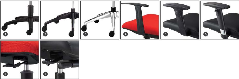 Sturdy 60mm polyurethane dual-wheel castors are designed for smooth gliding with safety feature, enable user to swivel in any directions in a perfect balanced-environment, and also reduce floor scratches and chair noise while moving. (Pic. 9)