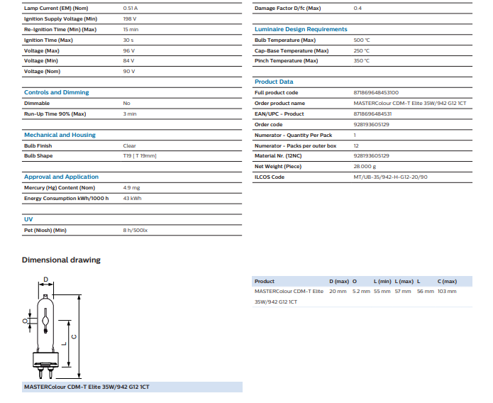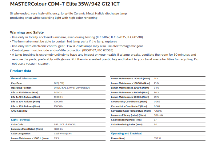 - Product Model: PHILIPS MASTERCOLOUR CDM-T Elite 35W/942 G12 (Order Code: 928193605129)