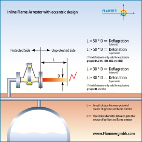 Ignited explosive gas mixture will propagate through the pipe in direction to e.g. storage tank. With pipe length flame speed increases. Up to a certain pipe length / pipe inside diameter ratio, the flame propagates at subsonic speed. Inline flame arrester approved for deflagration stops flame propagation at subsonic speed.
