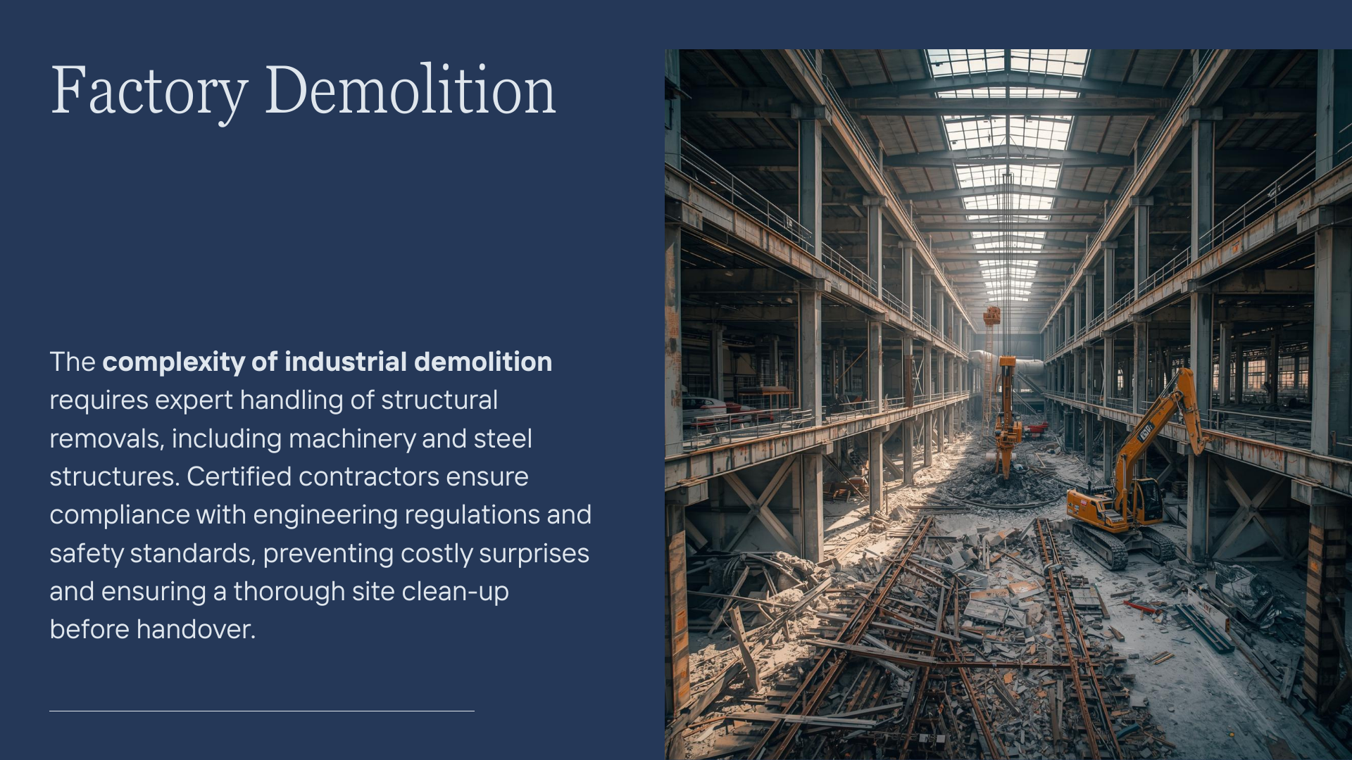 毫无疑问,安全是选择与这些专业人士合作的首要原因。他们对潜在危险和监管要求的了解,能够在复杂的拆除作业中保护工人、周边财产和公众的安全。