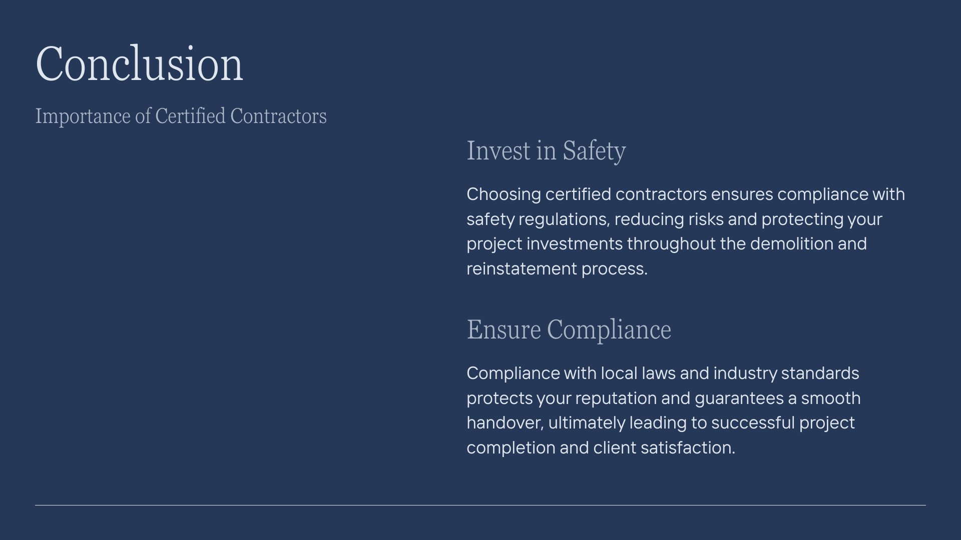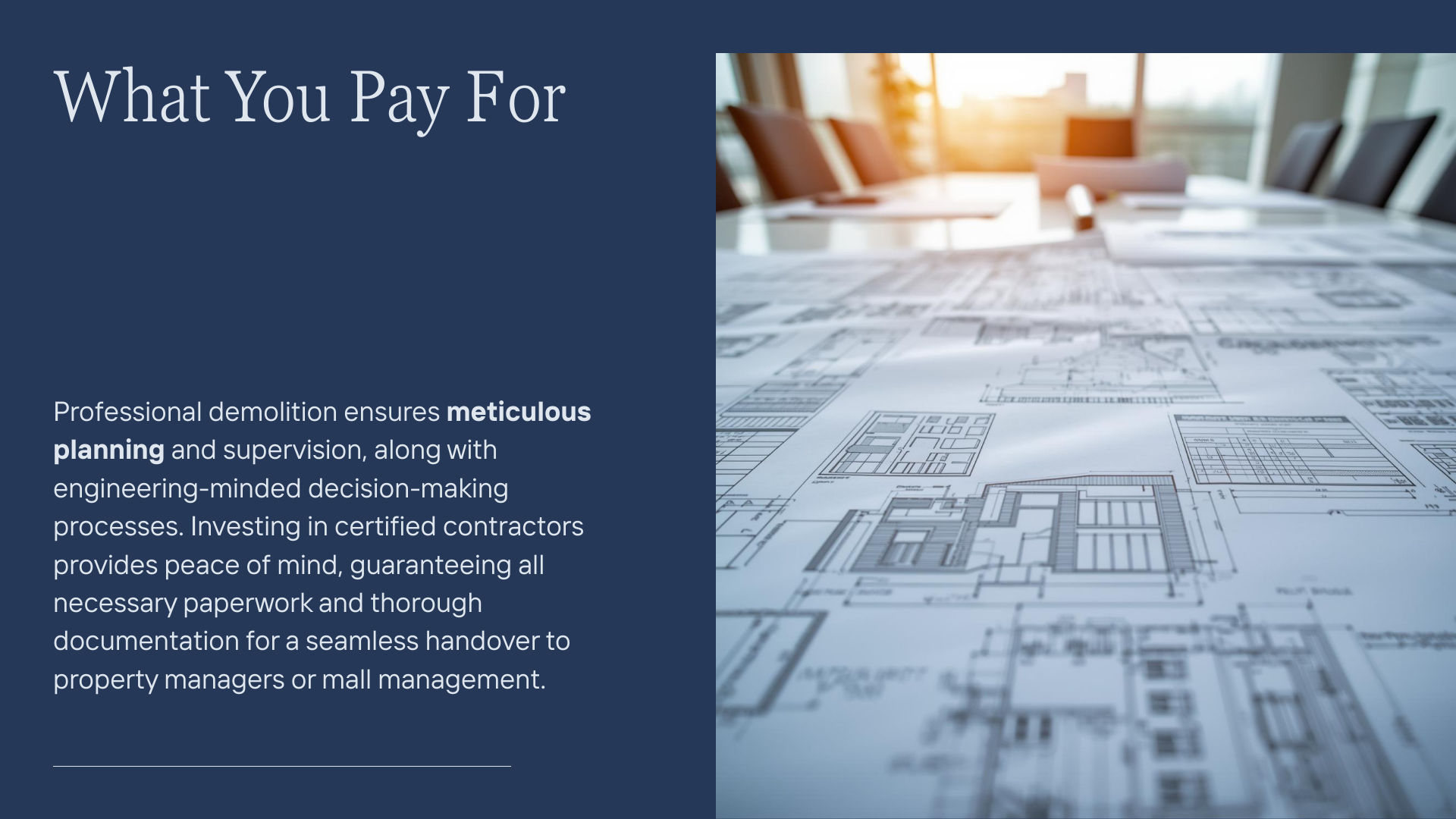 聘请能够每次都提供安全、合规、可预测结果的专业人员。因为归根结底,你买的不是拆除
