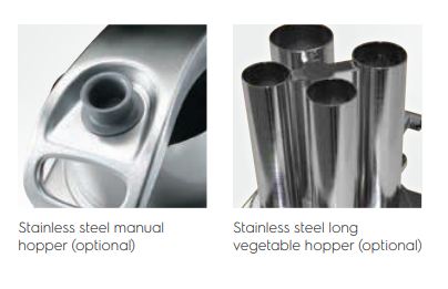 ► Easy loading of long and large vegetables with the stainless steel hoppers