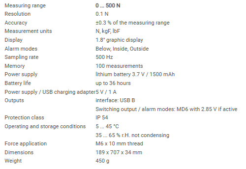 The measurement data and a statistical evaluation of the data stored in the Durometer (MIN / MAX / Average) are shown on the graphic display and can be transferred to a PC via the USB interface. In addition, the force measuring device offers a limit value function MIN / MAX, which can switch a multi-covered LED (yellow / green / red) and switching contacts.