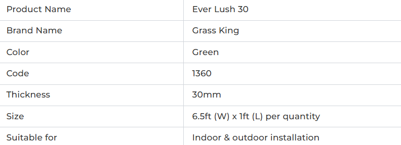 想拥有一年四季翠绿如新的户外空间?Grass King 草王可持续户外草坪地毯 [6.5 英尺宽] Ever Lush 30 – 1360 是您理想的选择。无论是阳台、庭院还是商业活动场地,它都能为您带来整洁、美观又安全的地面方案。MAN KIAN HARDWARE & TRADING SDN BHD 荣誉供应此产品,让每一位客户都能轻松实现绿意盎然的梦想。